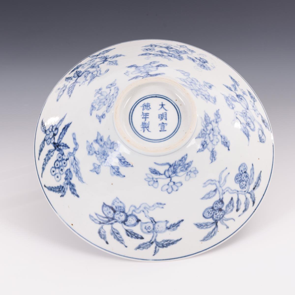 Feine, schattierungsreiche Bemalung mit verschiedenen Blütenstücken innen und verschiedenen Fruchtzweigen auf der Außenwandung. Leichter Ascheanflug in der Glasur.