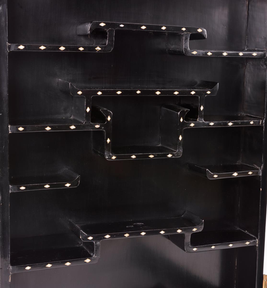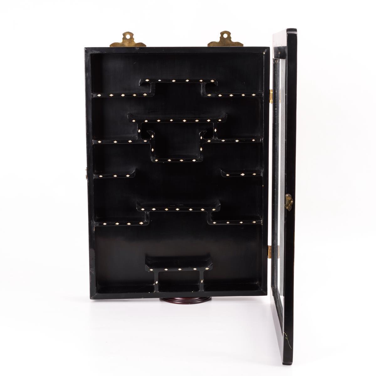 Türrahmen mit Drachen- und floralen Intarsien. Innen diverse Sockel für Schauobjekte, die Kanten ebenfalls mit Intarsienmuster. Glasplatte wird von oben in die Tür eingeschoben. Kleiner Hakenverschluss.