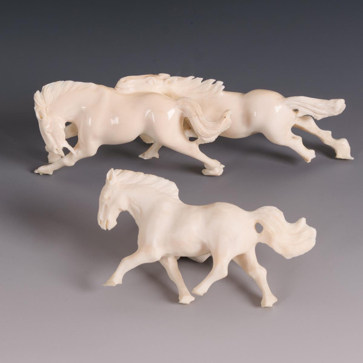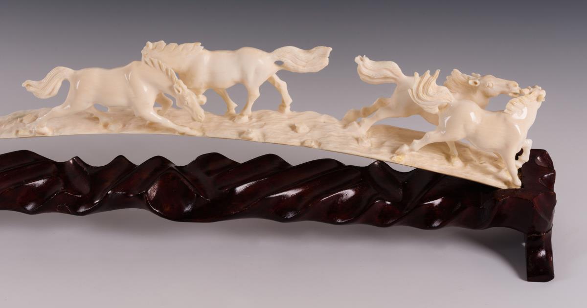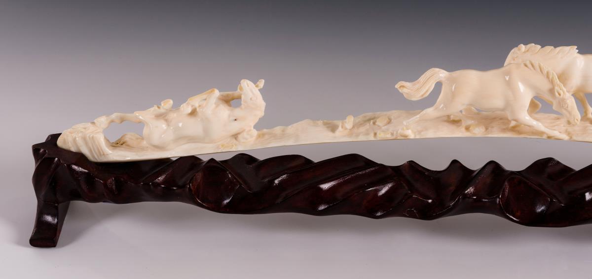Sieben wild dahinstürmende Pferde und ein sich wälzendes Tier, als Gruppe geschnitzt in der Bogenform eines Stoßzahnes. Auf hölzernem Sockel. Fast alle Pferde im Fußbereich geklebt oder lose. Wohl aber keine Materialverluste.