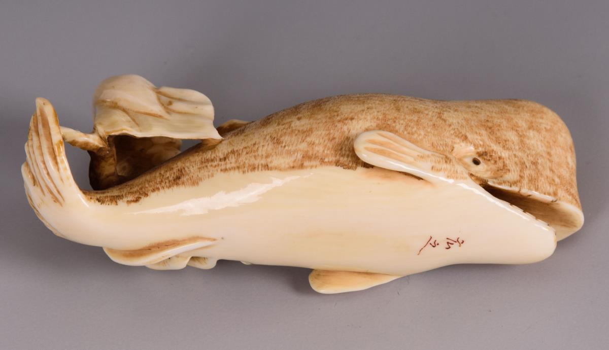 Elfenbein Netsuke - Wal und Tintenfisch.