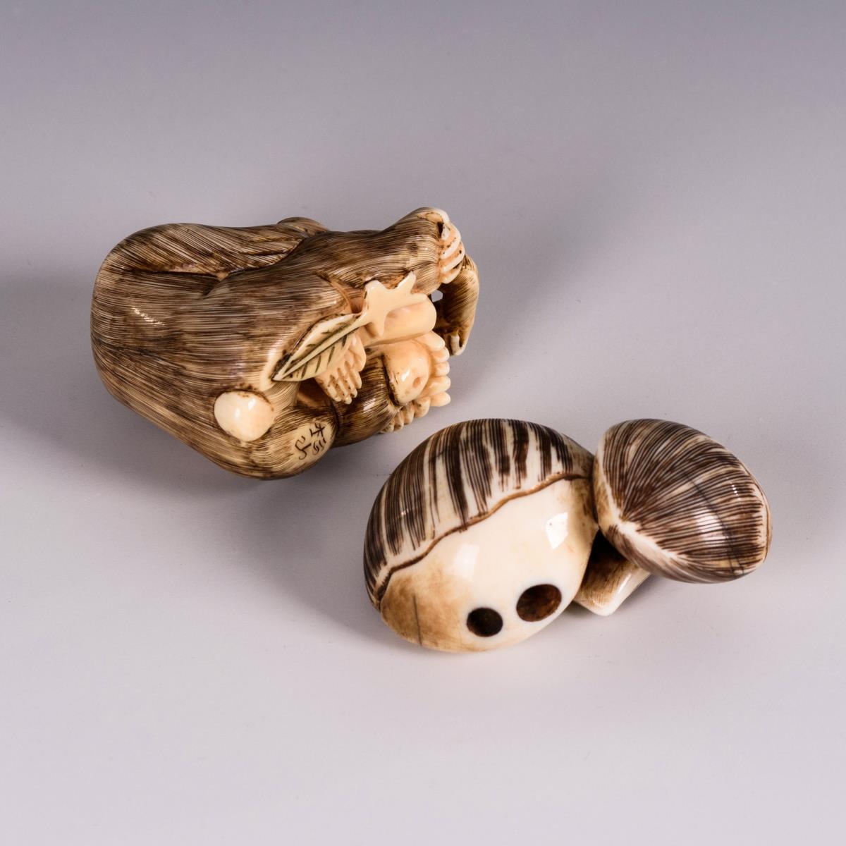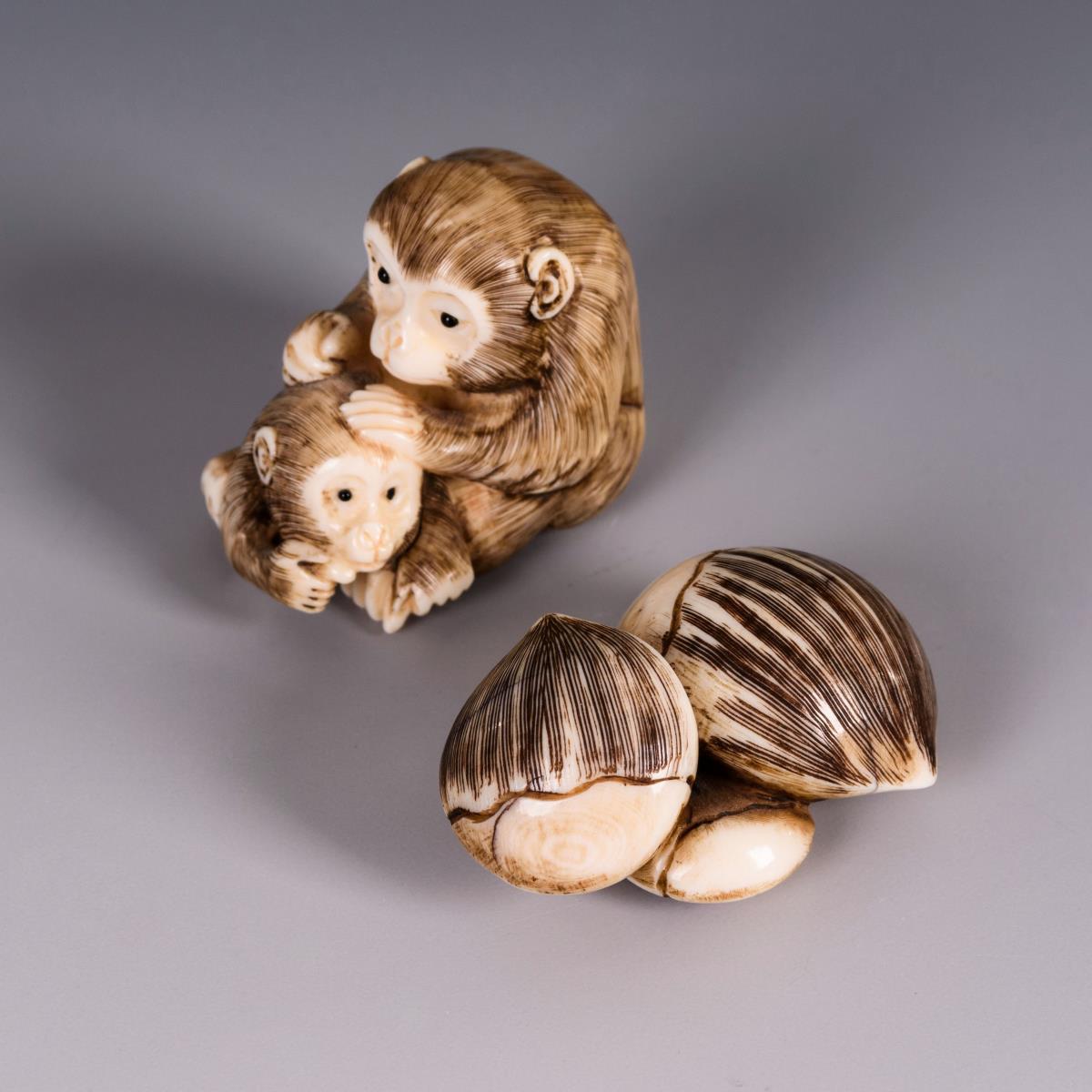 2 Elfenbein Netsuke - Nüsse und Affen.