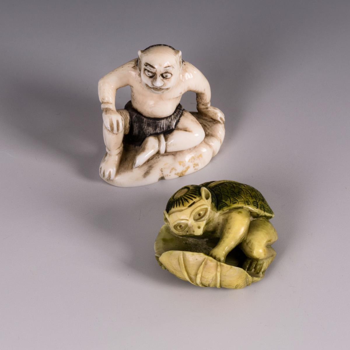 Kappa mit Schildkrötpanzer und -kopf, auf großem Blatt hockend, grün gefärbt. / Sitzende mythologische Figur mit Lendenschurz und langen Haaren am Hinterkopf.