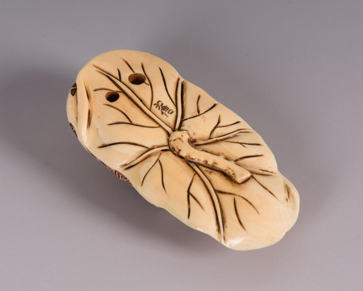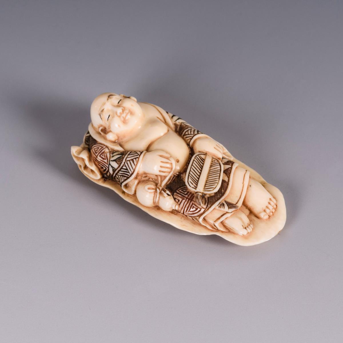 Elfenbein Netsuke - Hotei auf Blatt.