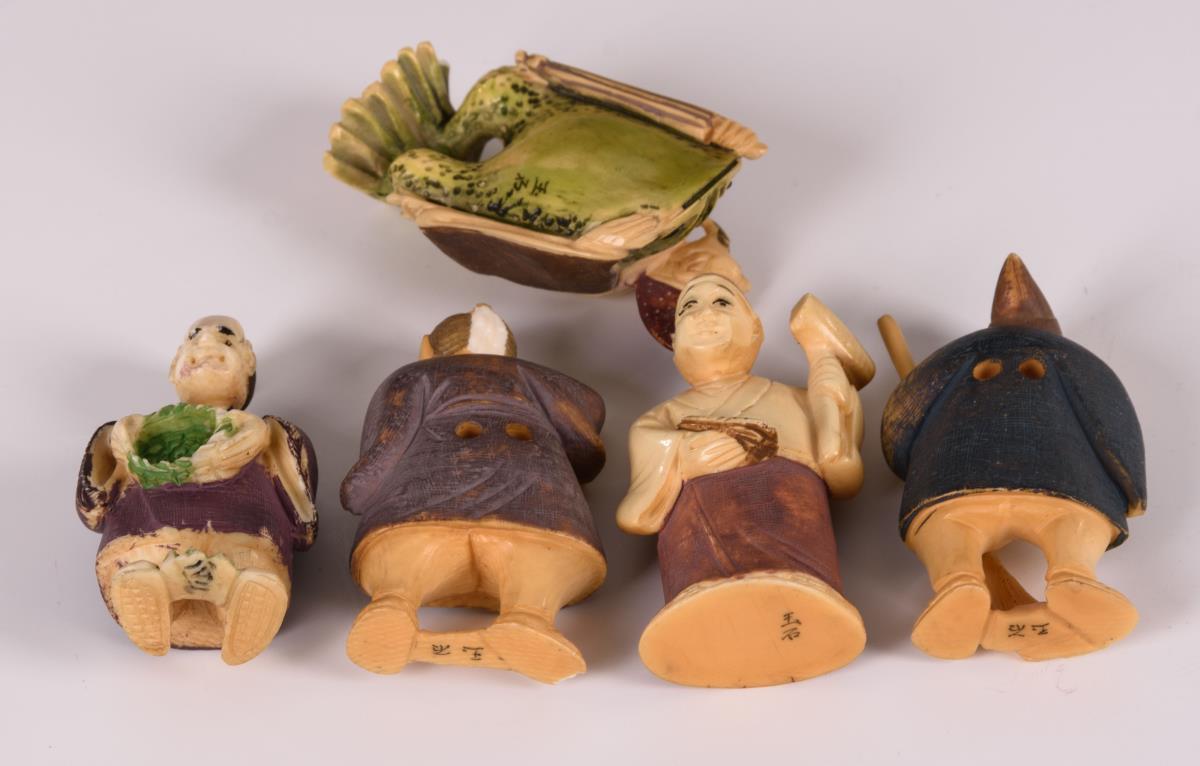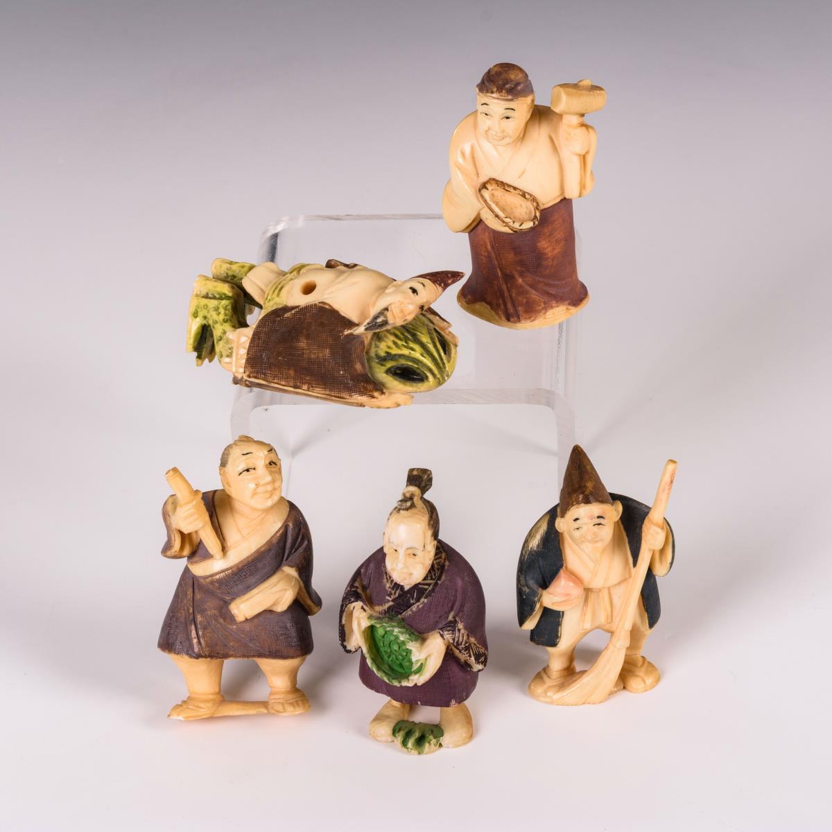 5 Elfenbein Netsuke - farbige Figuren.