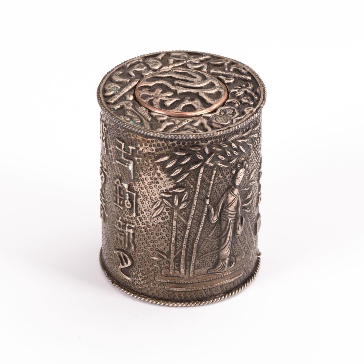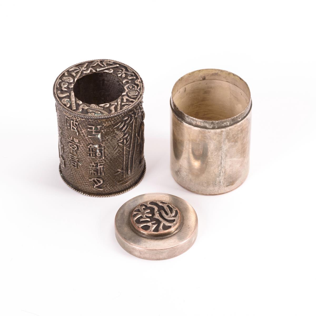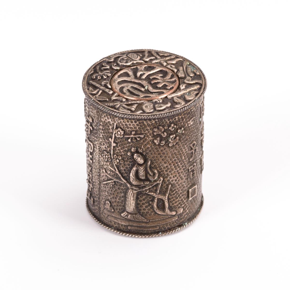 Schlichte Zylinderdose mit reliefiertem Deckel wird in eine passende, reliefierte Silberkartusche gesteckt, die mit einem winzigen Verschluss gesichert ist. Darauf figürliche Darstellungen und Schriftzeichen.