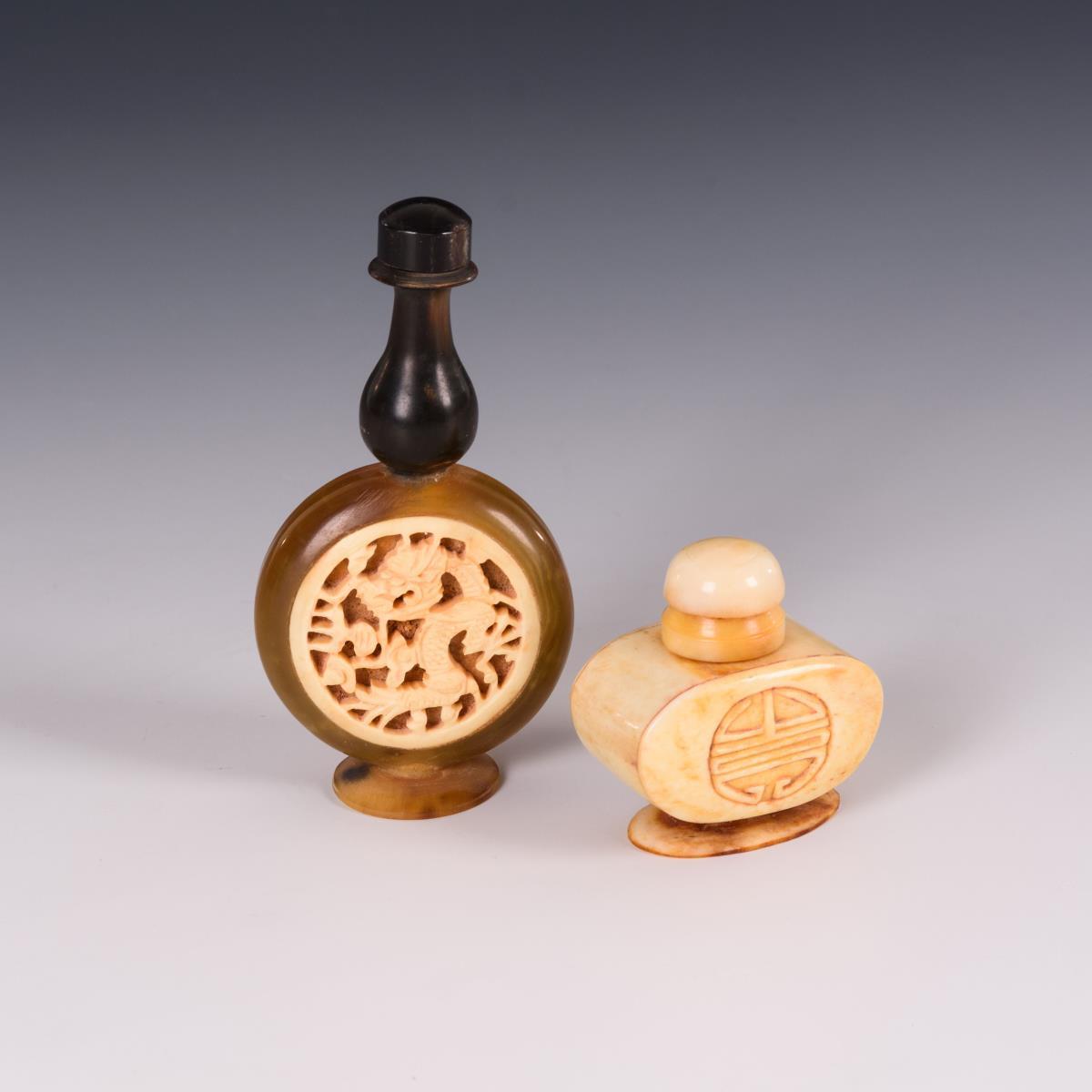 Schlanke Form aus Horn, runder flacher Bauch mit durchbrochen geschnitztem Drachenrelief aus Bein. / Kleine gedrungene Form mit Schriftzeichen für langes Leben und Relief eines Juorjin.