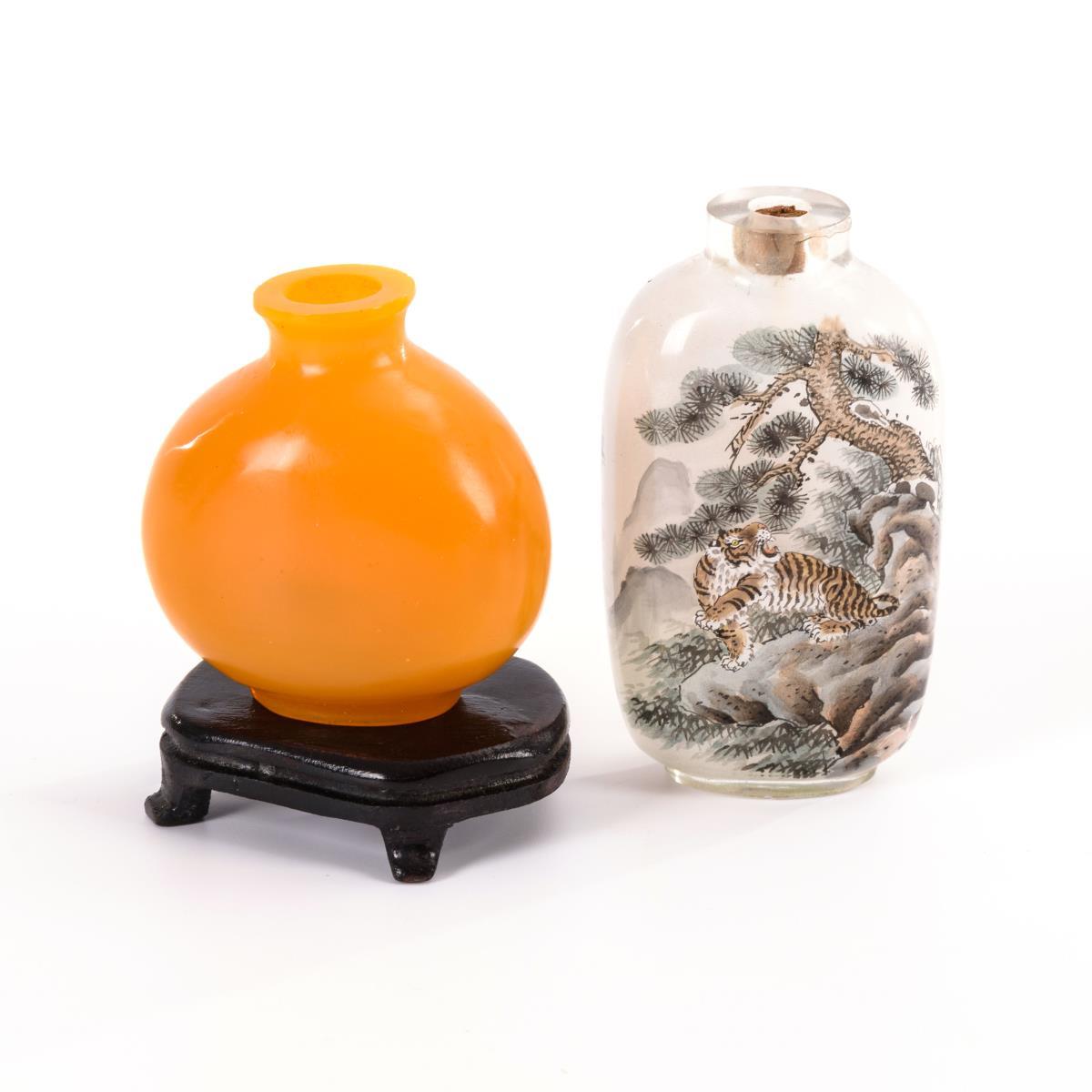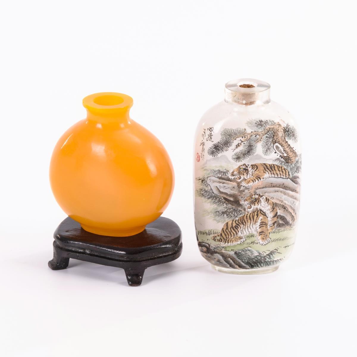 Schlanke Flasche mit Hinterglasmalerei, Tiger in Waldlandschaft. / Gedrungene Flasche aus gelbem Glas. Dazu kleiner Holzsockel. Beide ohne Stöpsel.