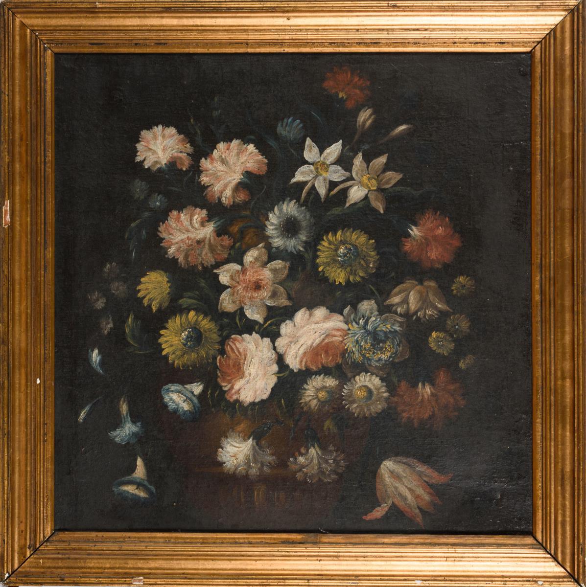 Großes Blumenbukett mit Nelken, Tulpen und anderen Blumen in goldener Vase. Leinwand doubliert, reinigungsbedürftig.