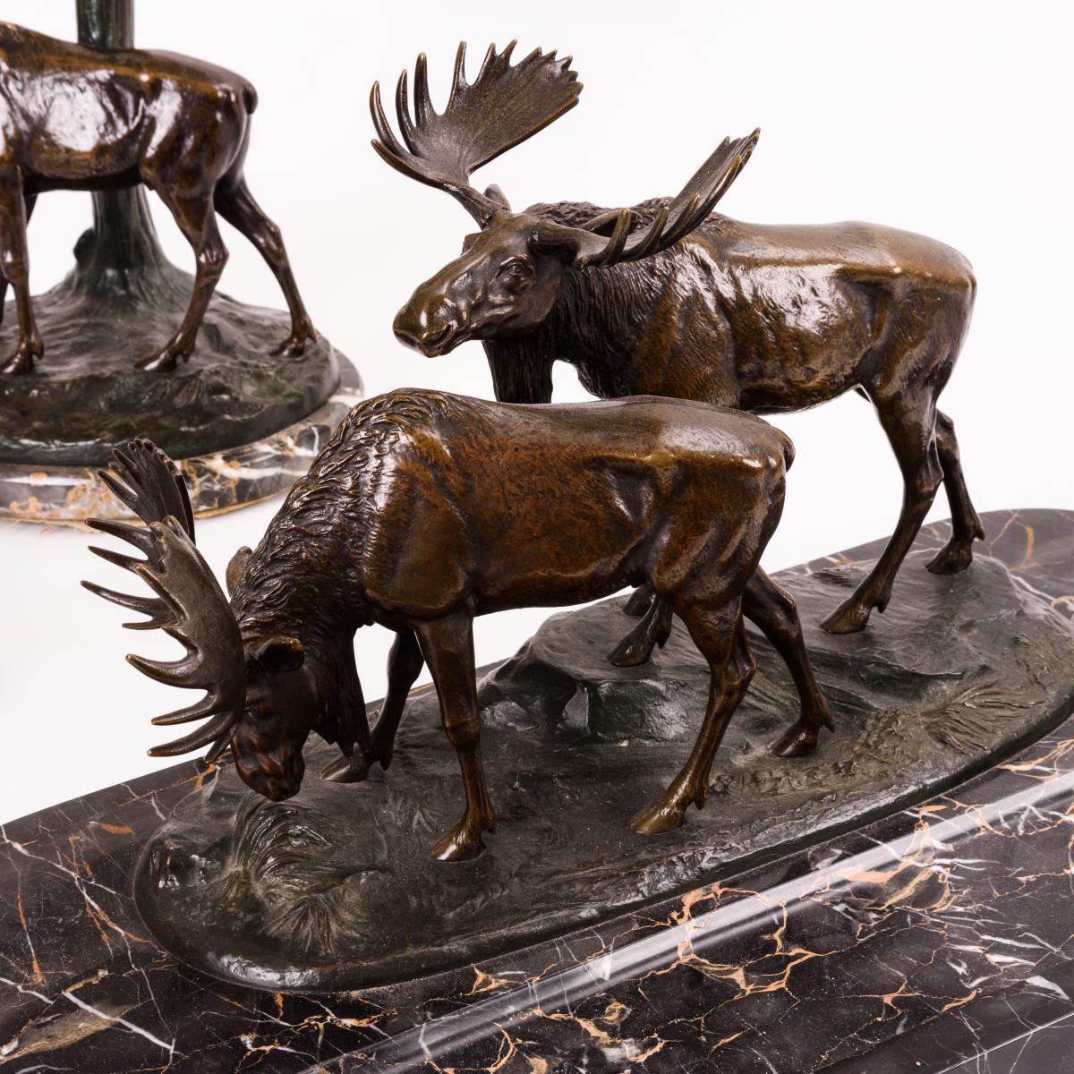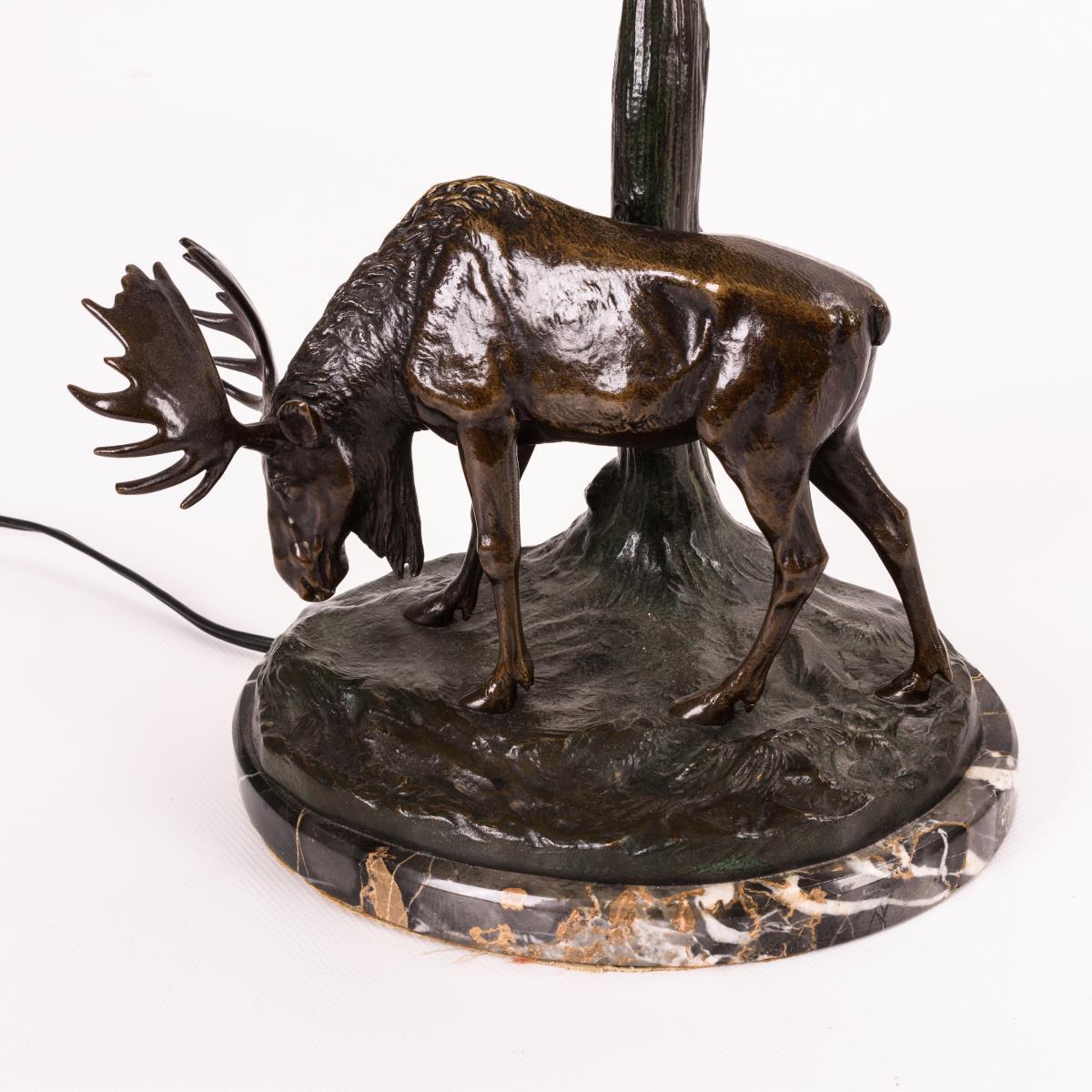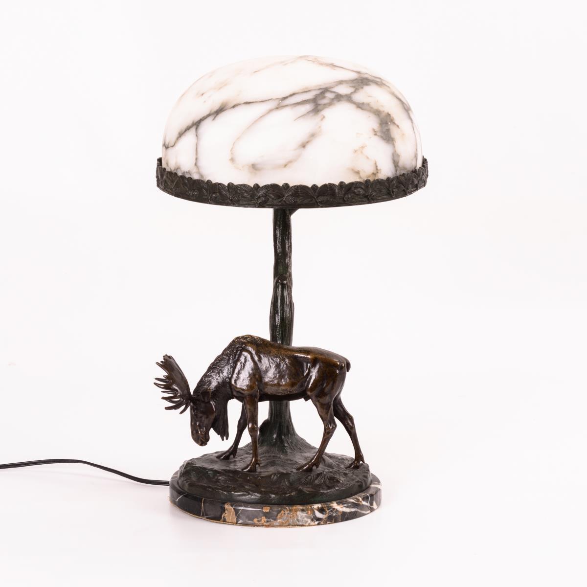 2 Bronze-Elche an der Stiftablage, 1 Elch an der Lampe mit baumartigem Schaft und Alabaster-Schirm sowie ein Marmor-Ascher. Kleiner Abplatzer am Ascher, geringe Schrammen/Haarrisse am Schirm, Verkabelung erneuert.