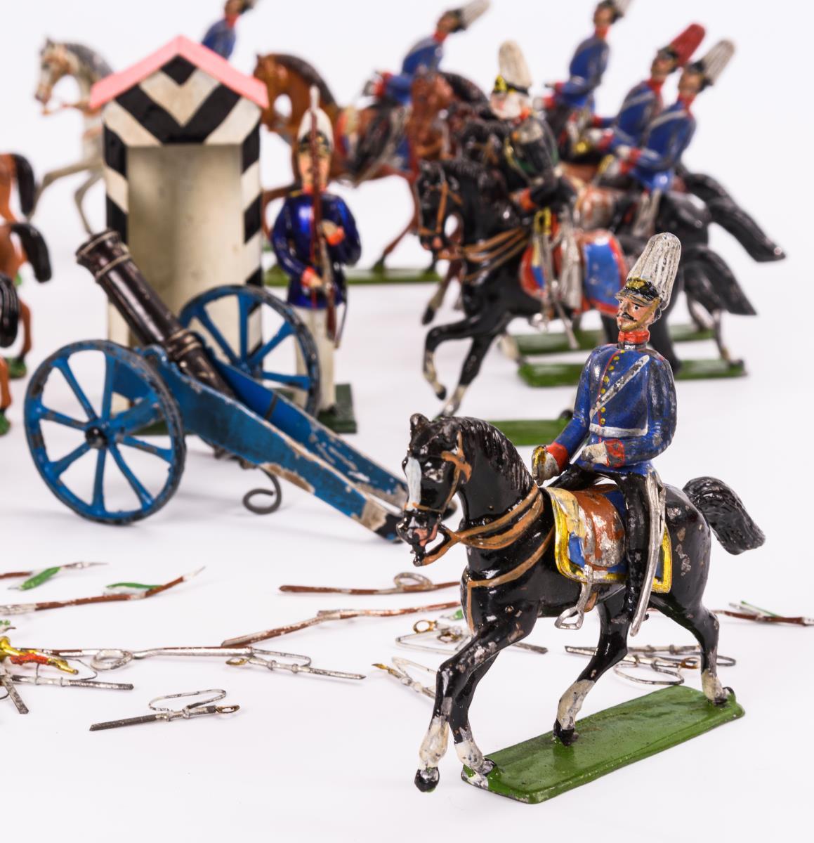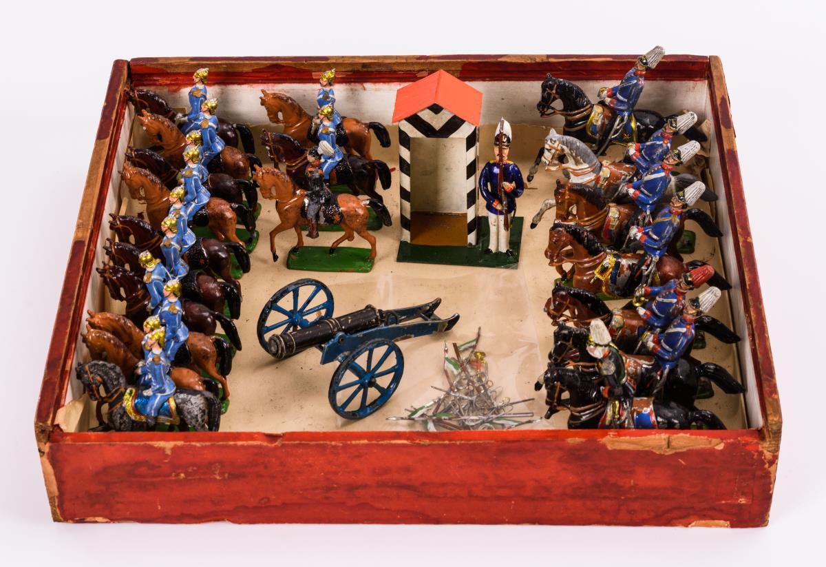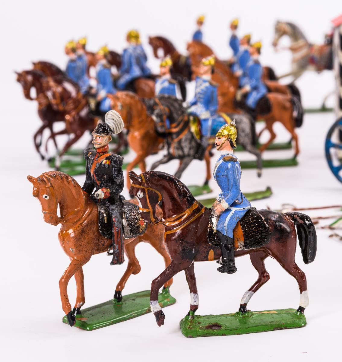 Ca. 20 Offiziere zu Pferde in 2 verschiedenen Größen, darunter sächsischer König Albert mit Offizieren. Dazu 12 Marinesoldaten sowie 1 Wachposten mit Häuschen. Farbdefekte.