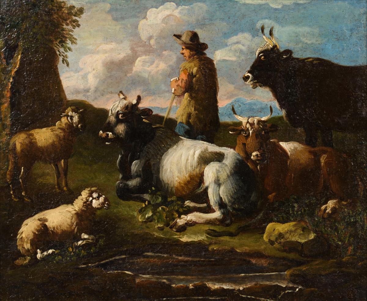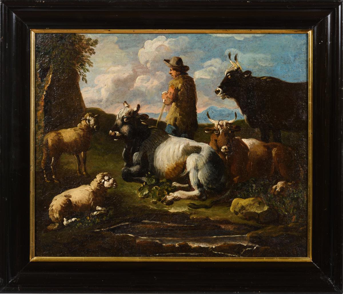 Hirte mit Rindern und Schafen in bergiger Landschaft. Leinwand doubliert.