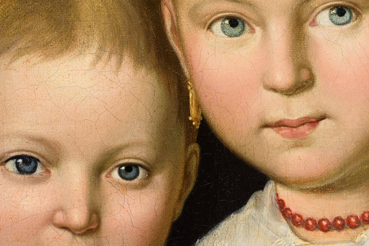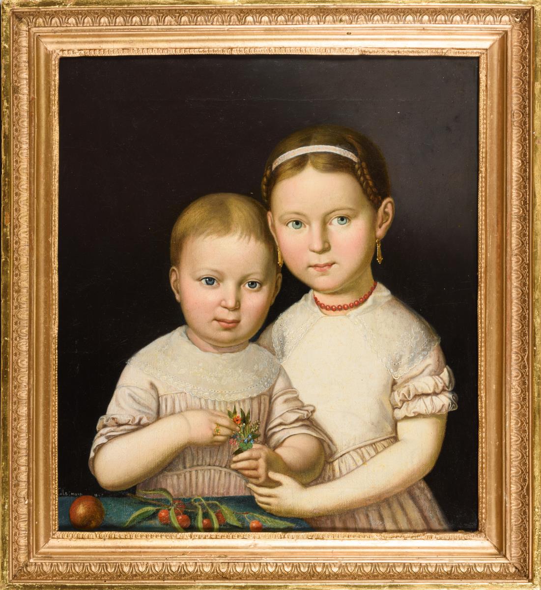 Qualitätvolles Bildnis zweier Schwestern mit detailliert gemalter Kleidung und fein gestalteten Figuren vor dunklem Hintergrund. Leichte Altersspuren.