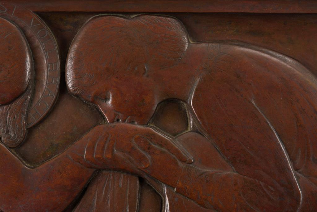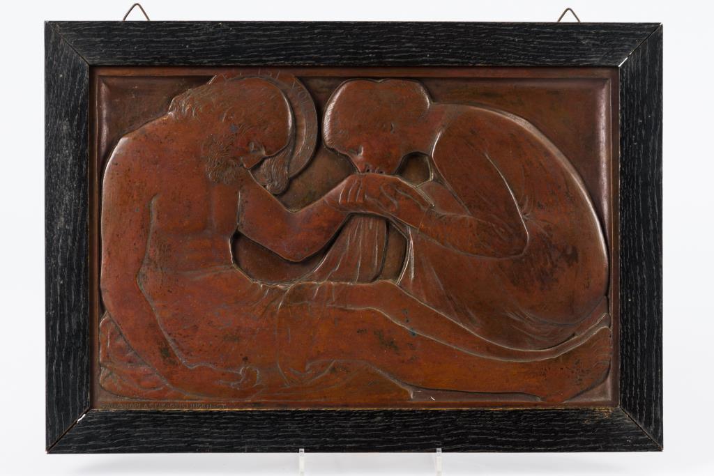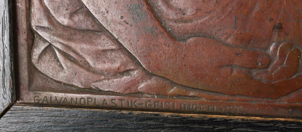 Galvanoplastik patiniert.Bezeichnet, Herstellermarke "Galvanoplastik-Geislingen-St" (wohl WMF).20 x 30 cm, geschwärzte Eichenleiste 24,5 x 35 cm.