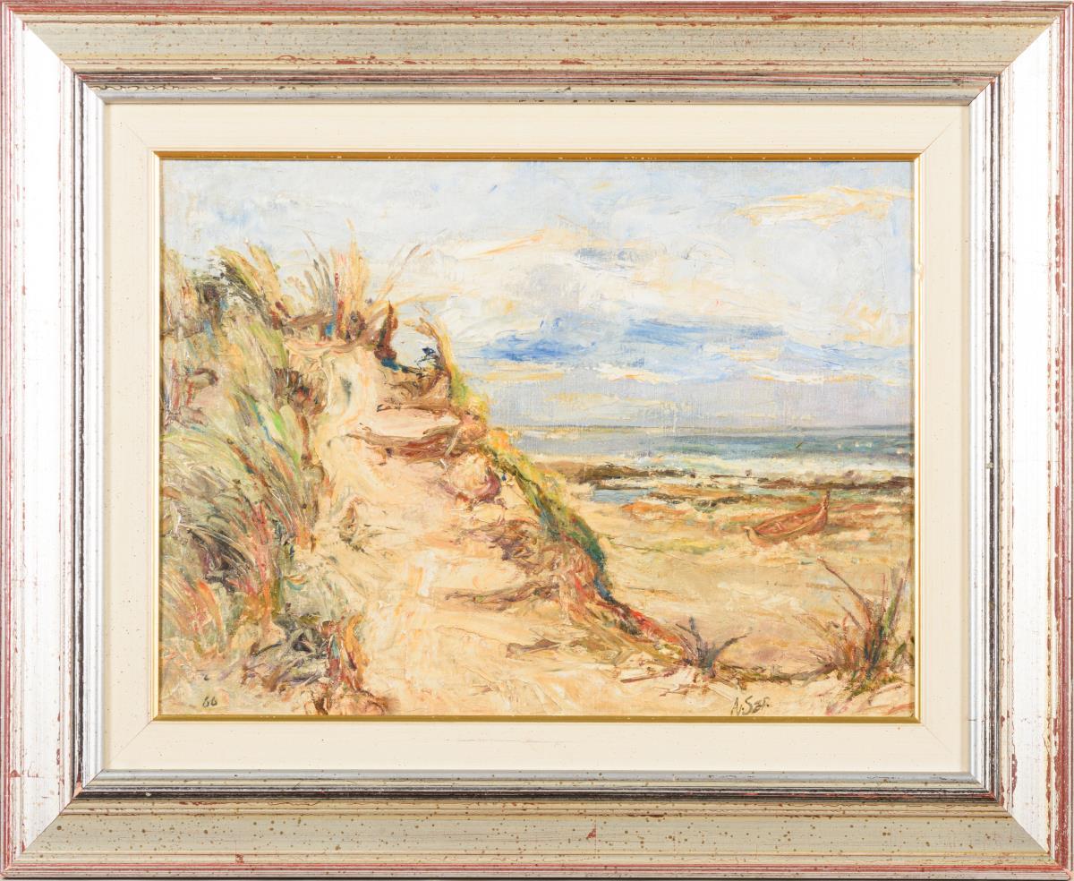 Sonniger Sandstrand mit bewachsenen Dünen.