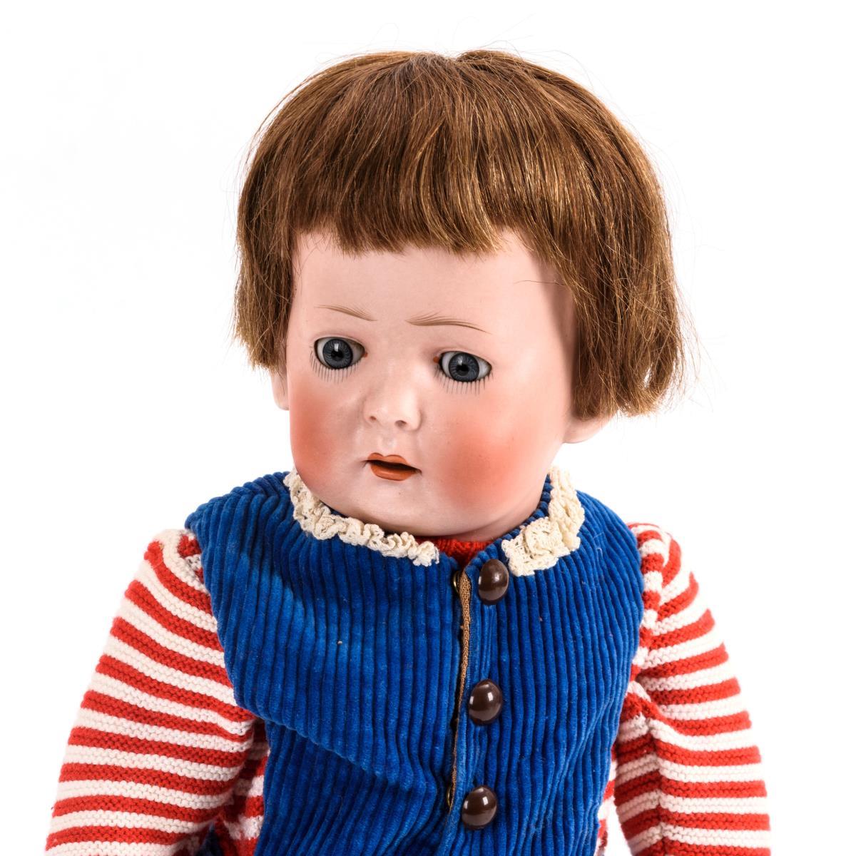 17-teiliger Toddlerkörper. Blaue Cordhose, rot-weißer Ringelpulli. Kopf durchleuchtet: ohne Defekte. Bespielt, 1 Finger geklebt.