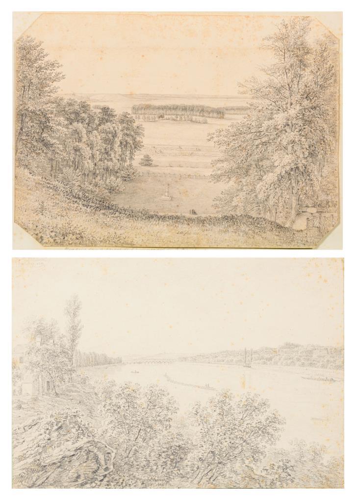 Fein gezeichnete Landschaft mit Park der Eremitage in St. Petersburg, bezeichnet "Une prise dans le parque de l´Ermitage près de St. Petersbourg" und Flusslandschaft. Stockflecke.