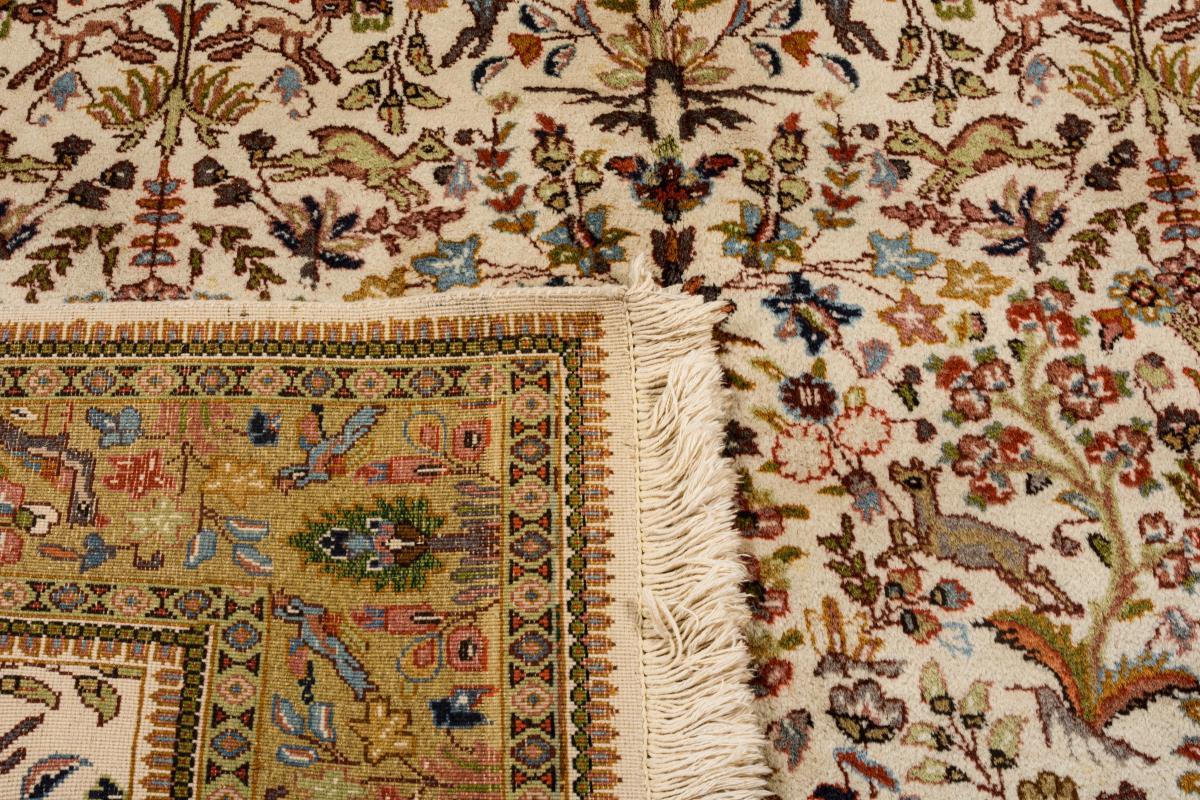 Üppige Blütenzweige und Tiere im Endlosrapport auf dem Mittelfeld. Bordüre mit Palmetten, Bäumen und Tieren. Kleinere Mottenschäden im Flor.