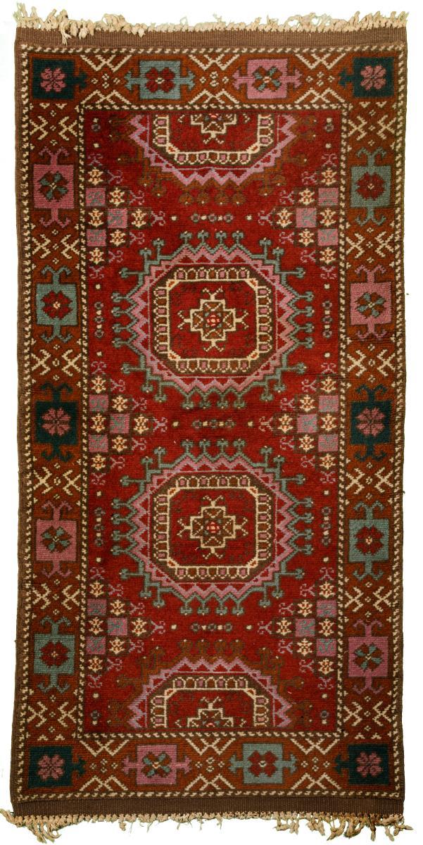 Wolle, handgeknüpft. Vorwiegend Rot, helles Blau, Ockerbraun, Rosa und Weiß. Ca. 92 x 197 cm.