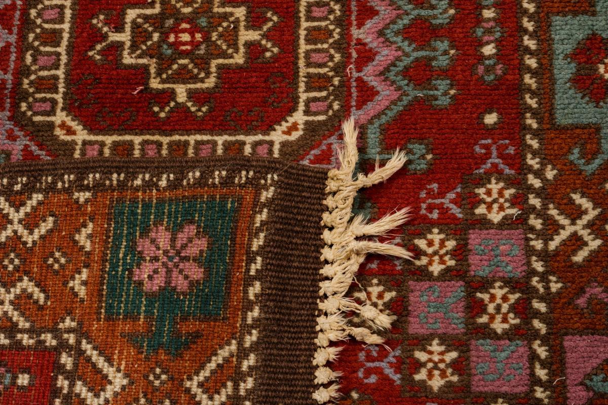 In Anlehnung an die Pendeh-Teppiche gestaltetes Mittelfeld mit großen achteckigen Salor-Güls und rautenförmigen Sekundärmotiven aus kleinen Kästchen. Einreihige Bordüre mit alternierender Musterung. Kleinere Mottenschäden, Gebrauchsspuren, defekte Fransenabschlüsse.