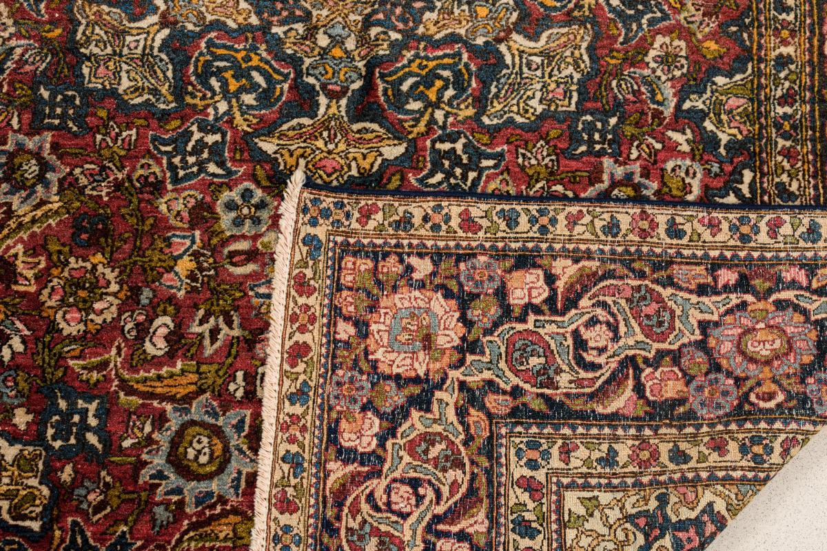 Achtteiliges Rosettenmedaillon auf floral durchgemustertem Spiegel mit korrespondierenden Ecken. Stilvolle Bordüre mit Blütenranken und Palmetten. Abgenutzter Flor, kleinere Mottenschäden.