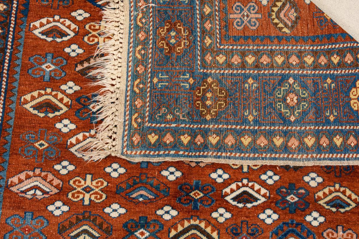 Rotes Mittelfeld in Allover-Musterung mit regelmäßigen Reihen stilisierter Blüten. Blaugrundige Kufi-Bordüre. Flor mit teils stärkeren Gebrauchsspuren.