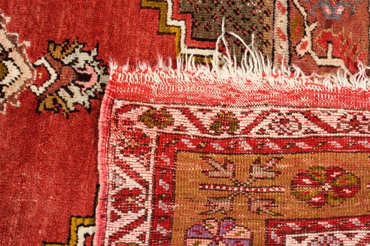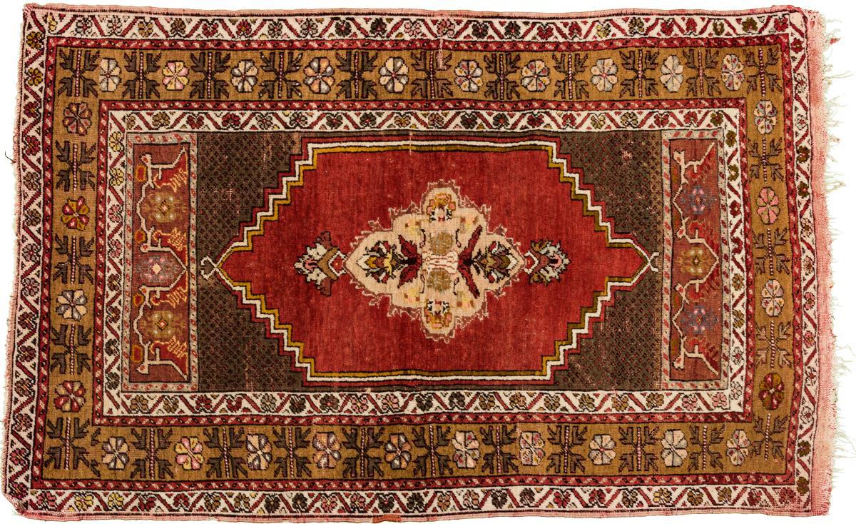 Rotes Stufenhexagon mit 3-facher Ränderung und zentralem Blütenmedaillon, auf braunem, rot gepunktetem Fond mit breiten Paneelen. Bordüre mit Hahnentrittmotiven und Blütenwellenranken. Restauriert, Reparaturen, Fehlstellen und Abnutzungsspuren am Flor.
