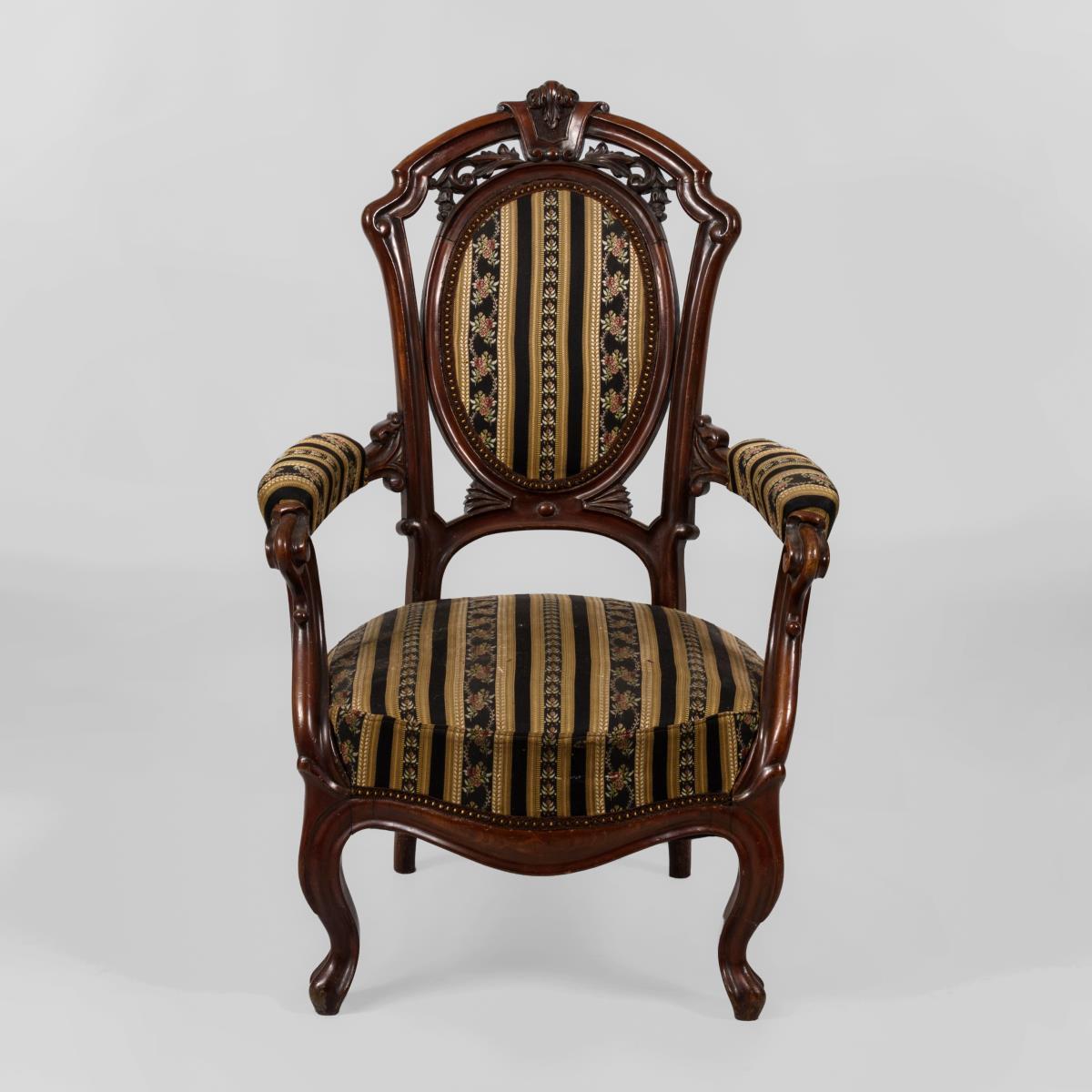 Armlehnstuhl in volutiert-geschwungener Form mit barocken Stilelementen, schildförmige, durchbrochen gearbeitete Rückenlehne mit ovalem Polster. Gestreifter Bezug mit Blumenranken. Alters-/Gebrauchsspuren, Polster und Bezug ergänzt.