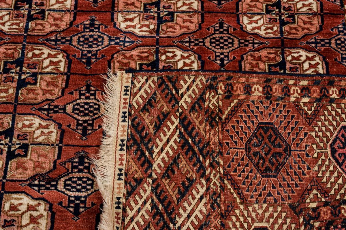 Typischer Gitterwerkdekor mit 5 x 11 Reihen aus großen Tekke-Güls und begleitenden Kurbaghe-Güls. Breite Bordüre mit einem Band aus strahlenförmigen Achtecken und turkmenischer Mustervielfalt. Schmalseiten mit abschließendem Rautendekor, geknüpftem Elem mit Ornamenten, kurzem Kelim und Fransen. Leichte Alters- und Gebrauchsspuren, leicht ausgeblichen, defekte Fransenabschlüsse.