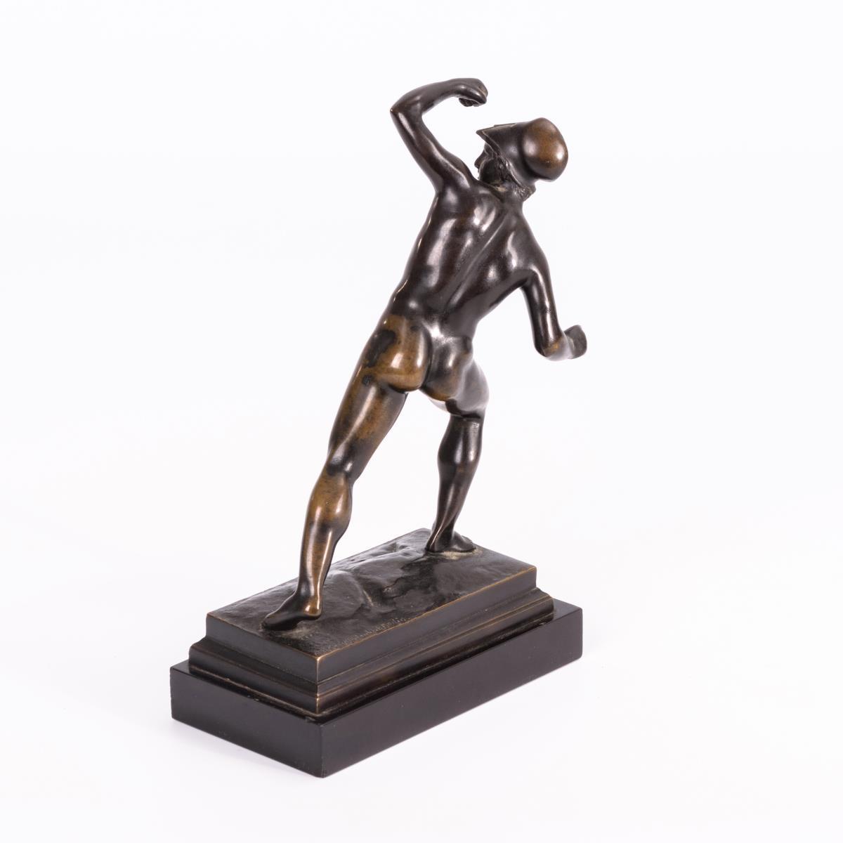 Nackter Mann mit Helm im Ausfallschritt sowie mit erhobenem Arm. Patina berieben, Chips an der Plinthe.