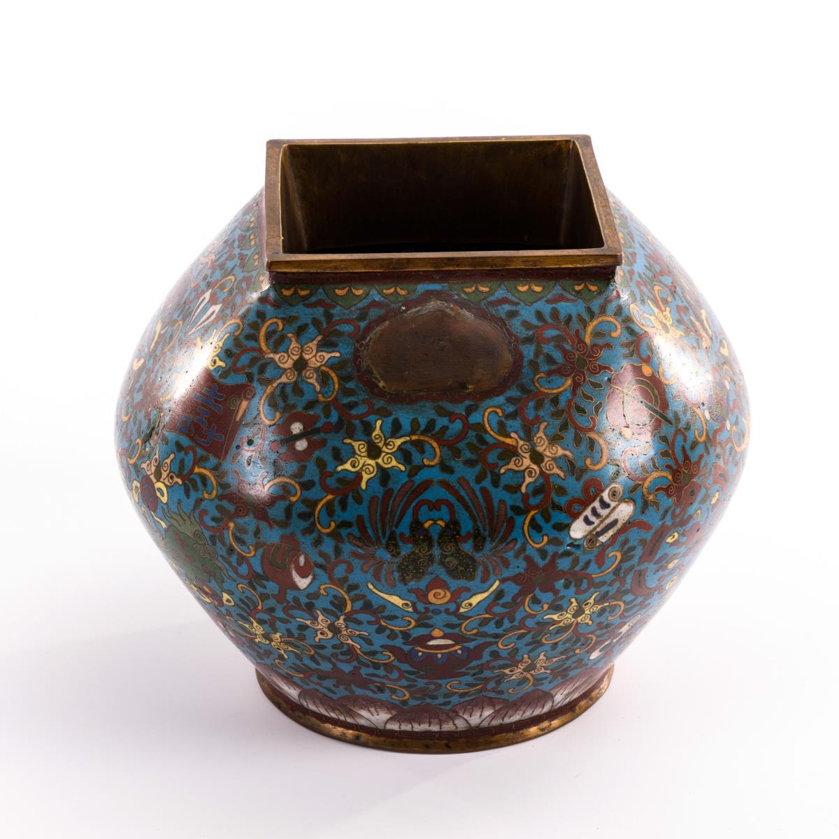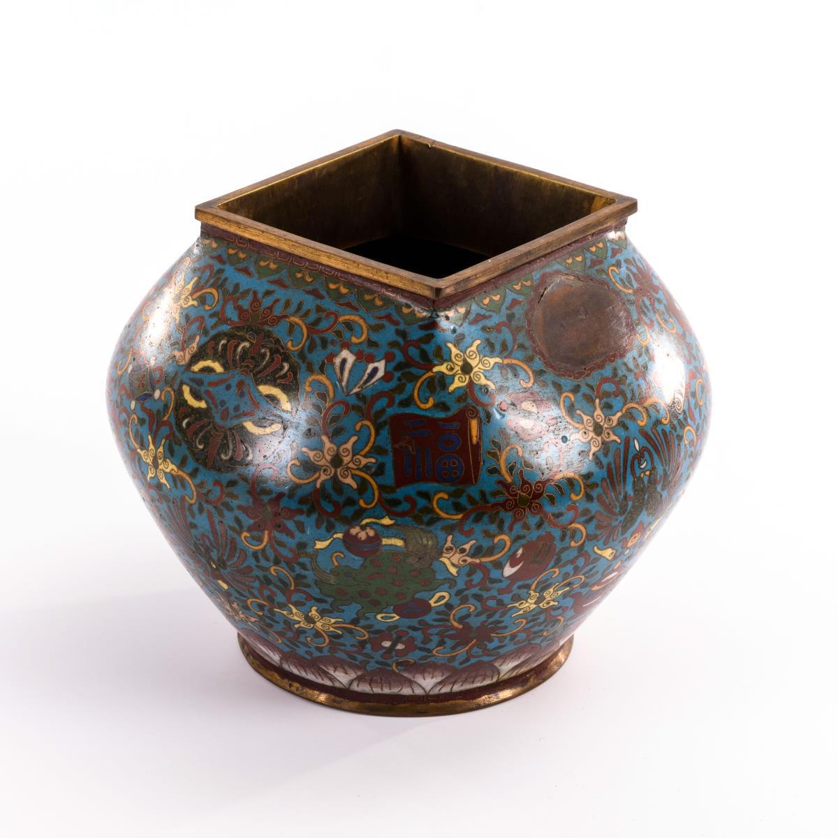 Messing und Email. H 19 cm, Öffnung 11 x 11 cm.