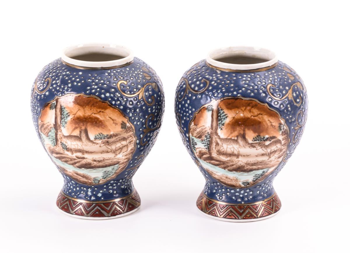 Gedrungene Vasenform mit je zwei identischen Kartuschen. Hirsche in Landschaft. Blaue Wandung mit weißen Punkten in Emailfarben.