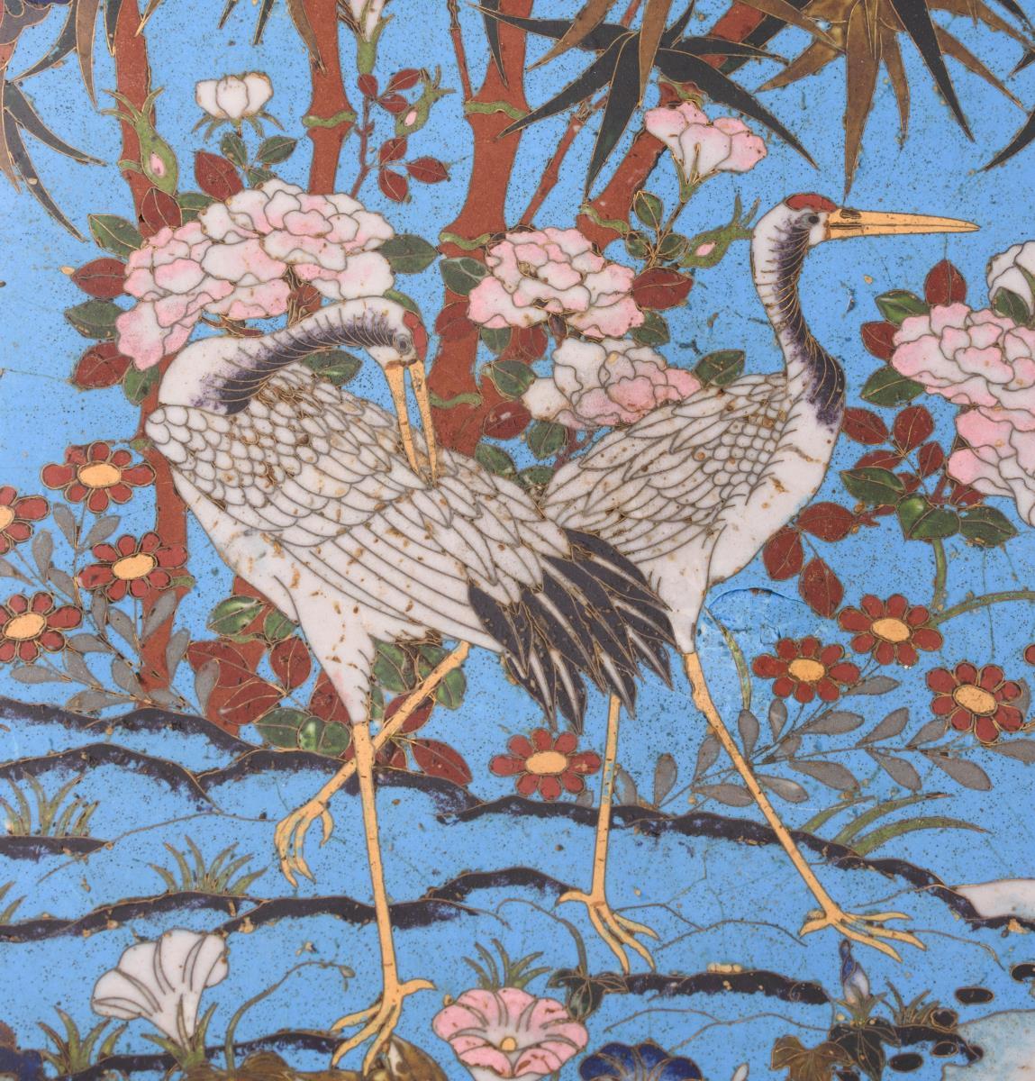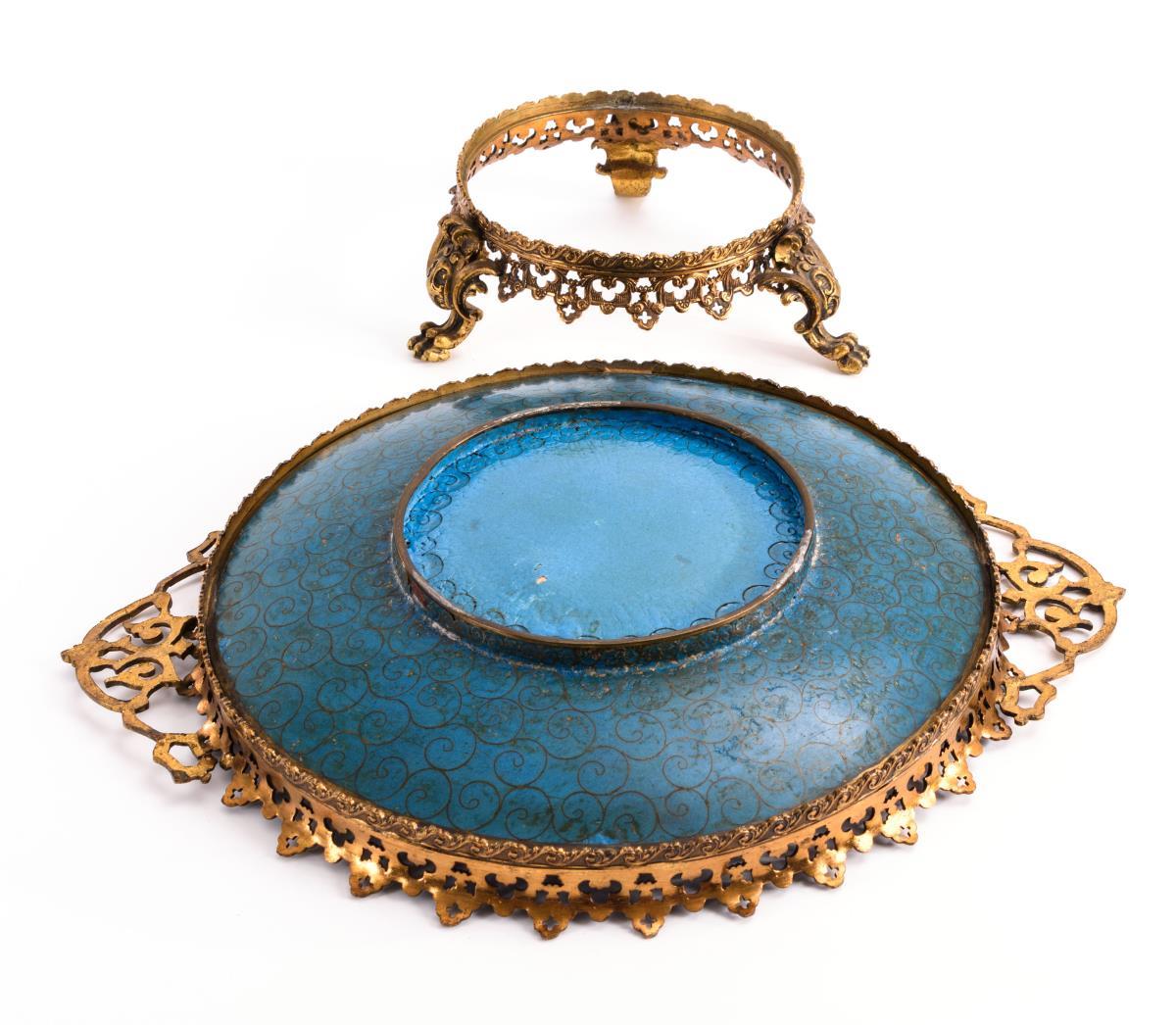 Kranichpaar zwischen verschiedenen Blüten vor Bambushain. Teller mit zierlicher, wohl europäischer Bronzefassung mit Handhaben und drei Beinen. Fußteil kann gelöst werden. Alters- und Gebrauchsspuren, eine stärkere Druckstelle im Untergrundblau.