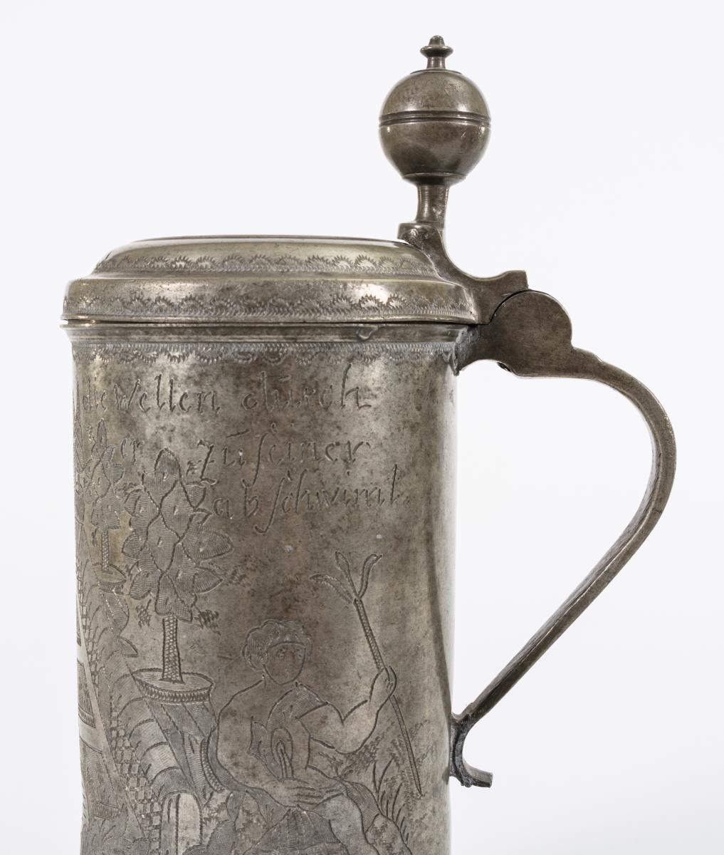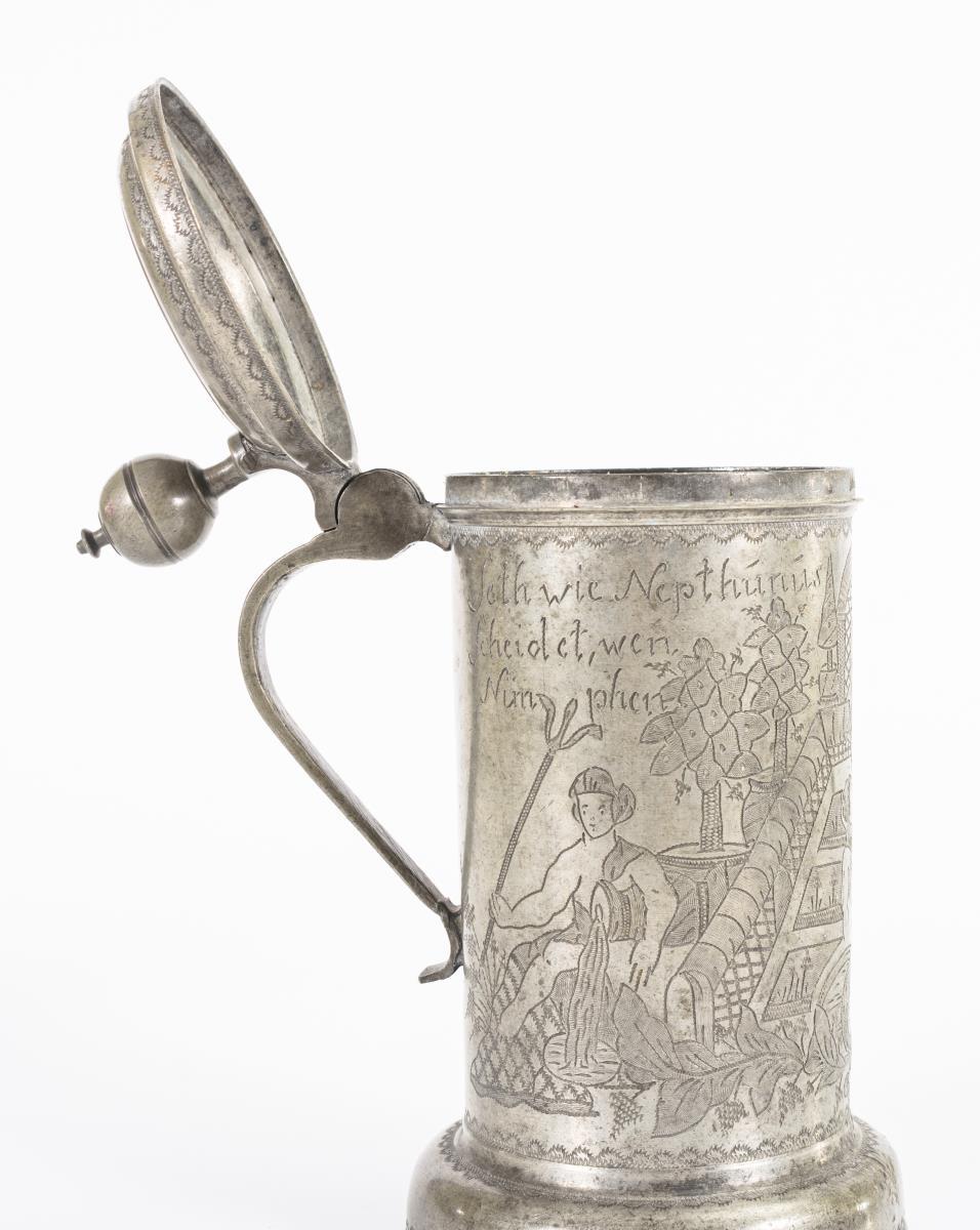Fast die gesamte Wandung des Walzenkruges bedeckende, überaus prächtige Flechelgravur mit Neptun und Flussgöttern in idealer Gartenlandschaft sowie Sinnspruch: "Seth wie Nepthunus die Welten durchscheidet, wen er zu seiner Nünphen abschwimt". Auf dem Deckel Monogramm "CGW 1776". / Leicht konischer Walzenkrug, auf dem Deckel Gravur "C. Taute 1741". / Dose in Schwanform mit Rundfuß und Scharnierdeckel sowie Gravur "SM". / Ungemarkte Helmkanne mit Gravur "JGB 1739". Je einige Alters-/Gebrauchsspuren, Fußansatz der Dose gelötet.