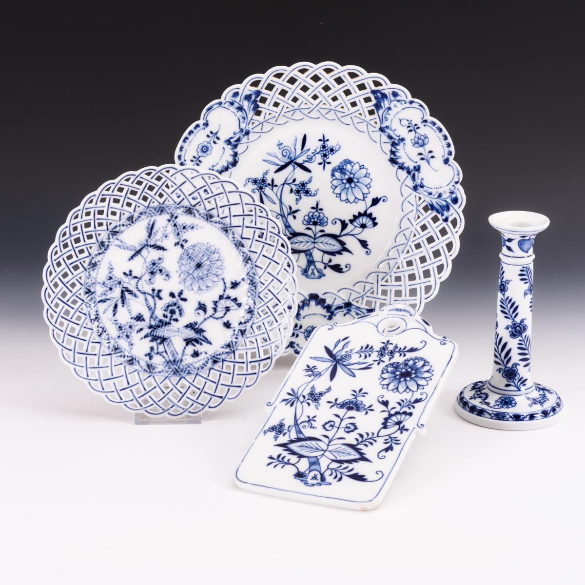 2 Zwiebelmuster-Durchbruchteller, -Kerzenleuchter und -Brettchen. Meissen.