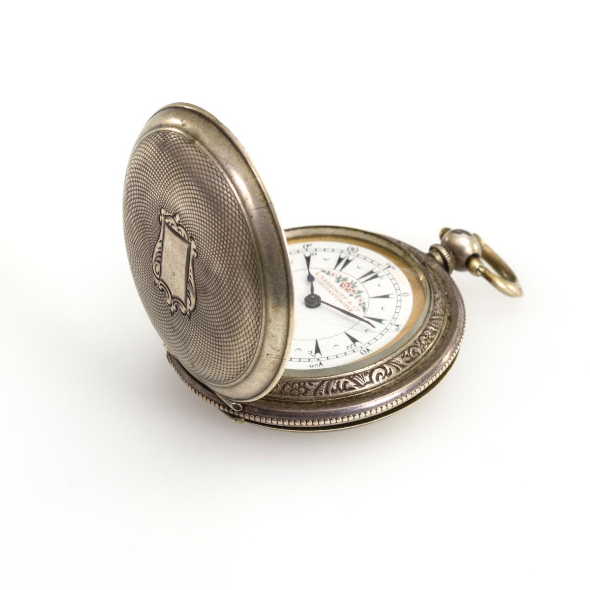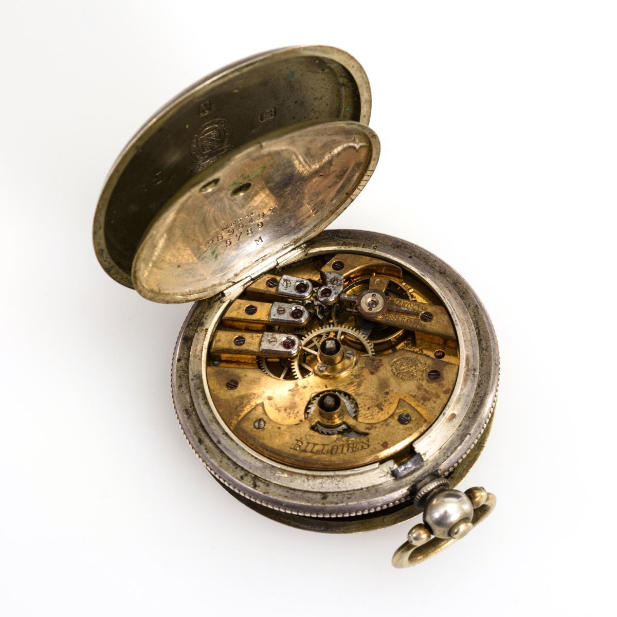 Brückenwerk mit Ankerhemmung, Schraubenunruh, gebläuter Spirale und Schlüsselaufzug. Herstellerprägung Werk: Billodes, Gravur mit arabischen Zeichen. Weißes Emailzifferblatt mit osmanischen Keilziffern, Minuterie, kleiner Sekunde und gebläuten Spade-Zeigern. Herstellerprägung Anzeige: K. Serkisoff & Co., Constantinople.