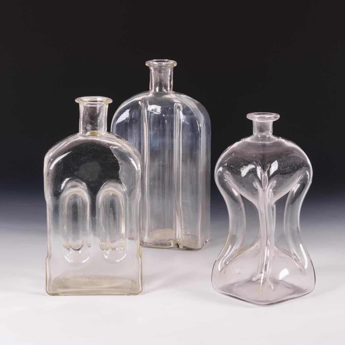 Greifflasche (H 29,5 cm), Kuttrolfflasche (H 27,5 cm) und Kuttrolf (H 26 cm). Kleine Bestoßung an 1 Mündungsrand.