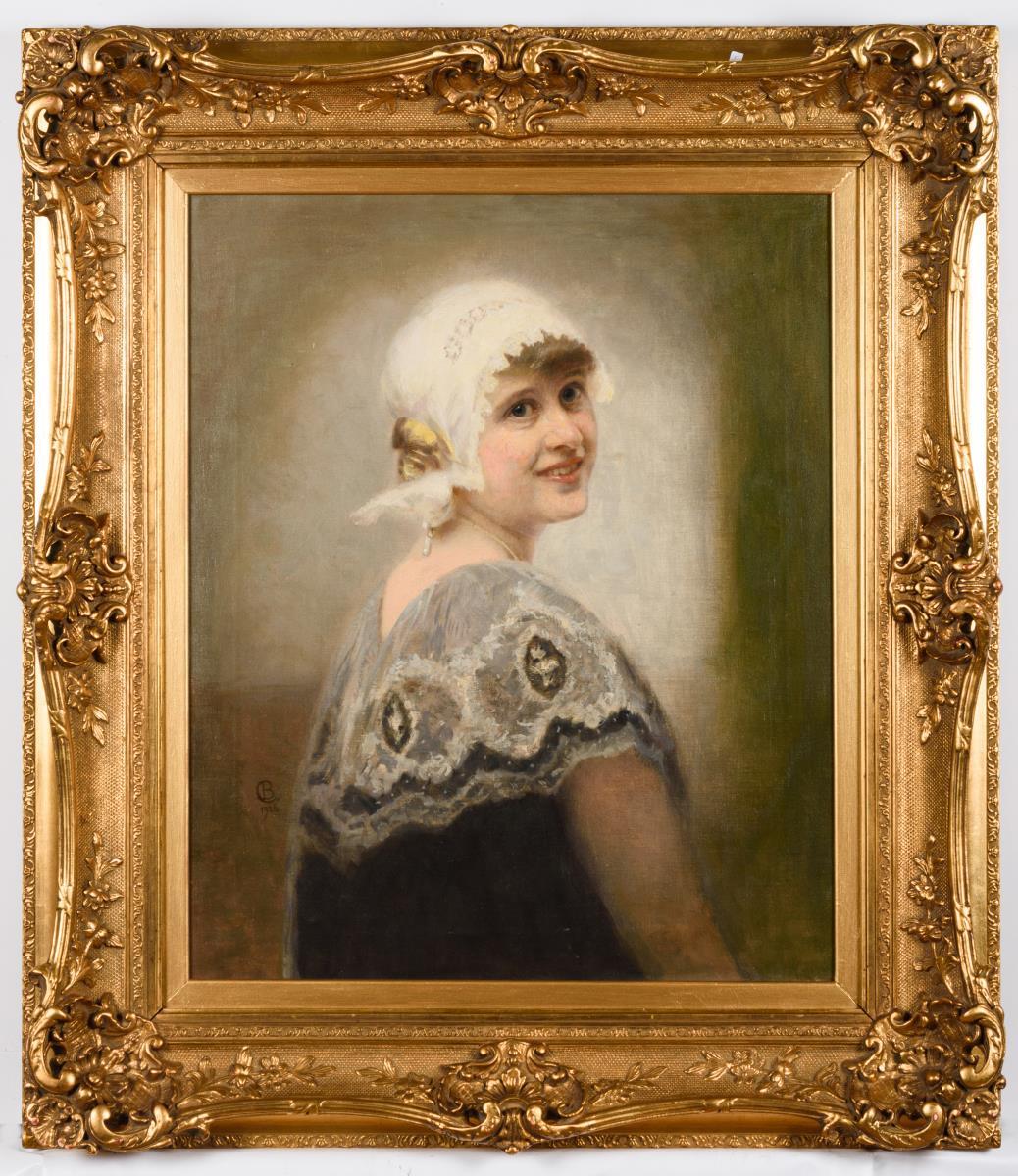 Junge, lachende Frau mit weißer Haube und dunklem Kleid mit Spitzenkragen.
