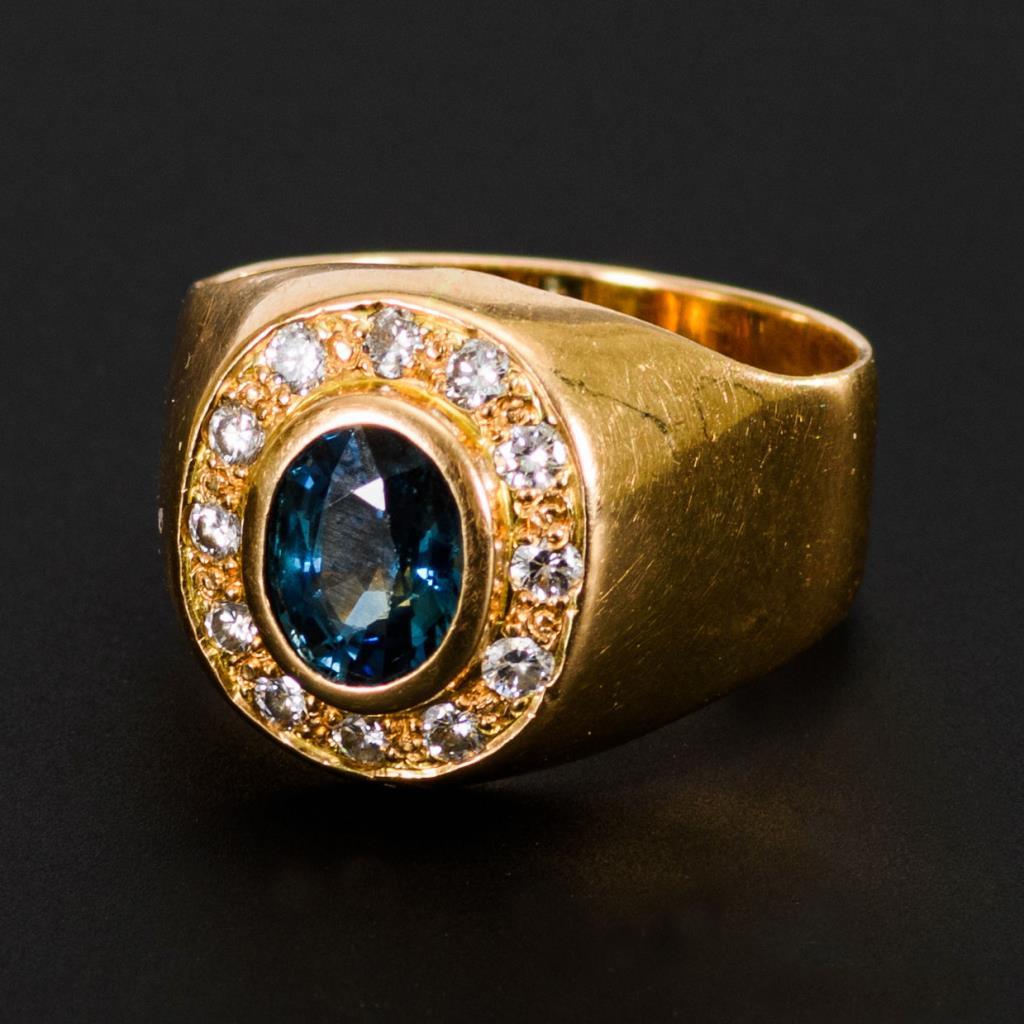 Breiter Ring mit Saphir, umringt von 12 kleinen, eingelassenen Brillanten.