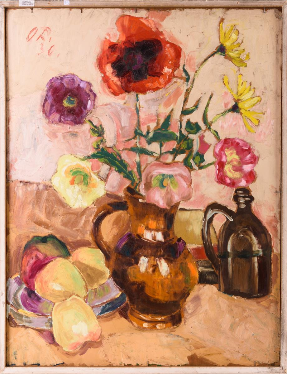 Felsiger Hang mit blühenden Pflanzen sowie Blumenstrauß in Kanne auf dem Tisch neben Obst.
