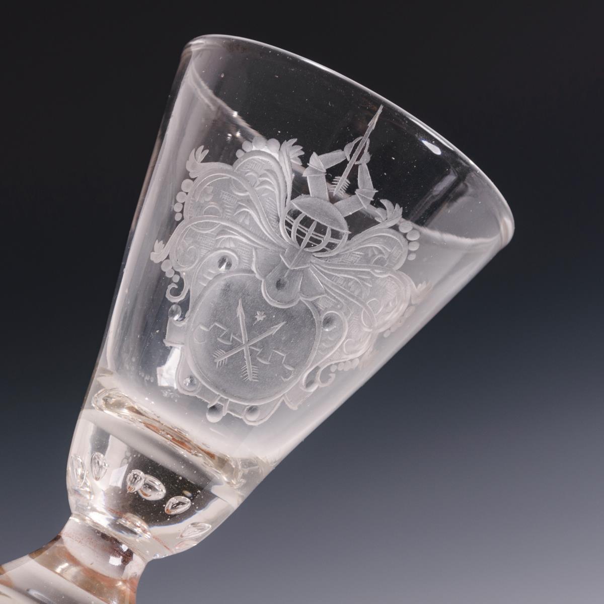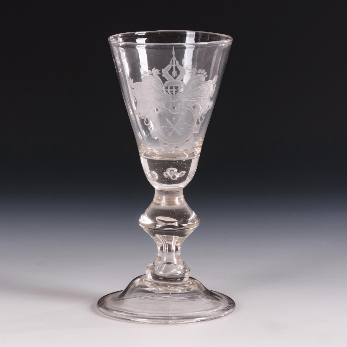 Konische Kuppa mit einem eingestochenen Luftblasenkranz am Boden, nodierter Hohlschaft, Rundfuß mit umgeschlagenem Rand, Abriss. Schauseitig ein mattgeschliffenes, teils geblänktes Wappen mit zwei gekreuzten Pfeilen und Helmzier.