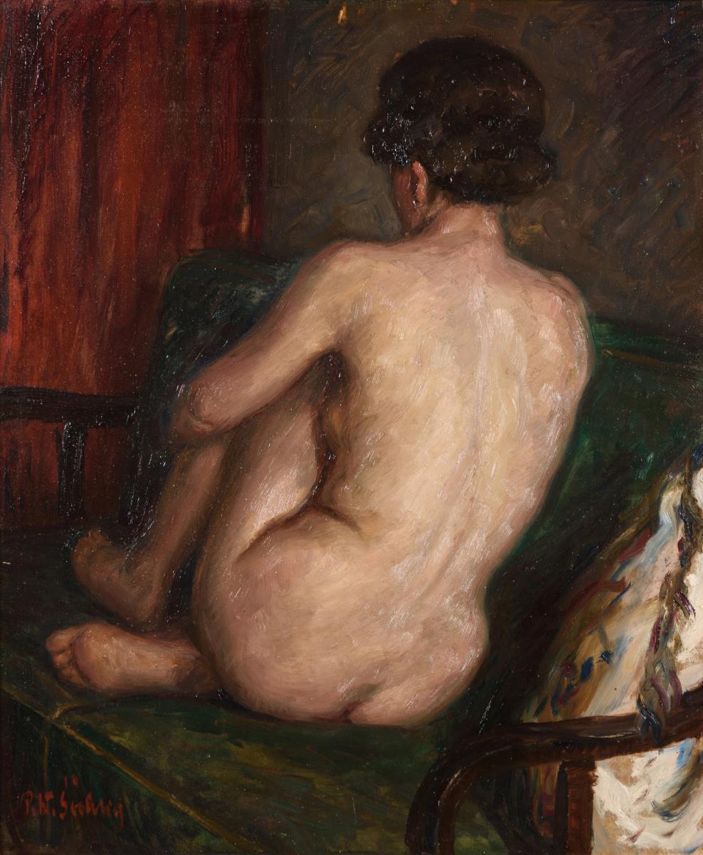 Auf einem roten Möbel sitzende nackte Frau, dem Betrachter den Rücken zugewandt.