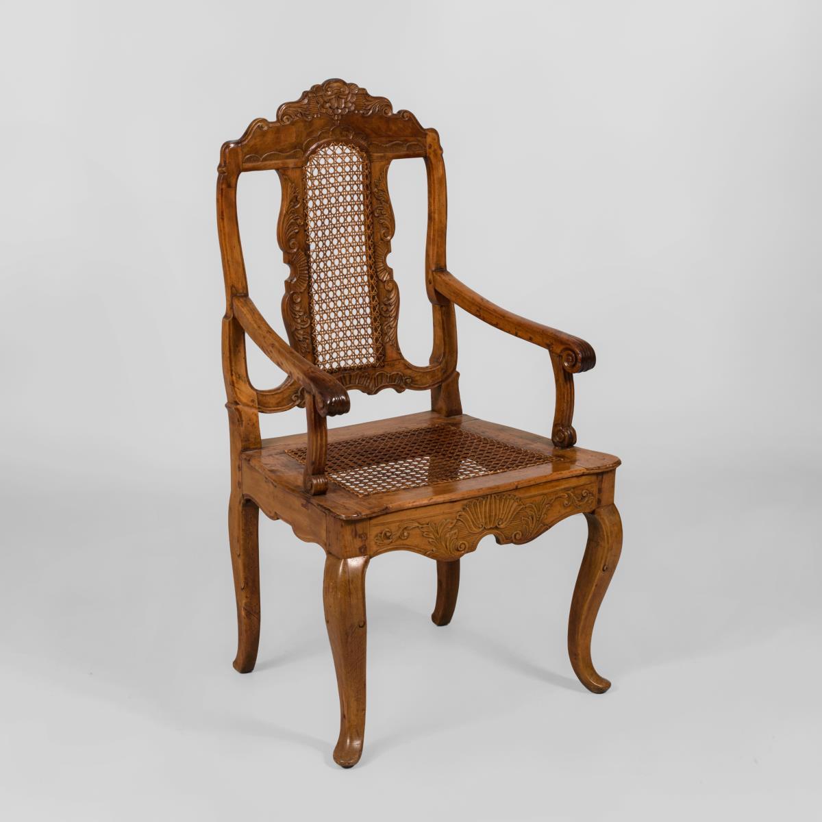 Armlehnstuhl mit stiltypisch geschwungenem Gestell, dekoriert mit Akanthusblattschnitzereien, Rückenlehne und Sitzfläche mit Korbgeflecht. Alters-/Gebrauchsspuren, Trockenrisse, alt restauriert, Korbgeflecht ergänzt.