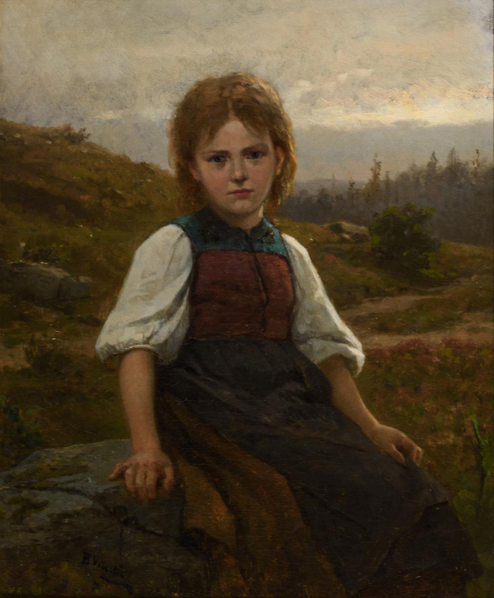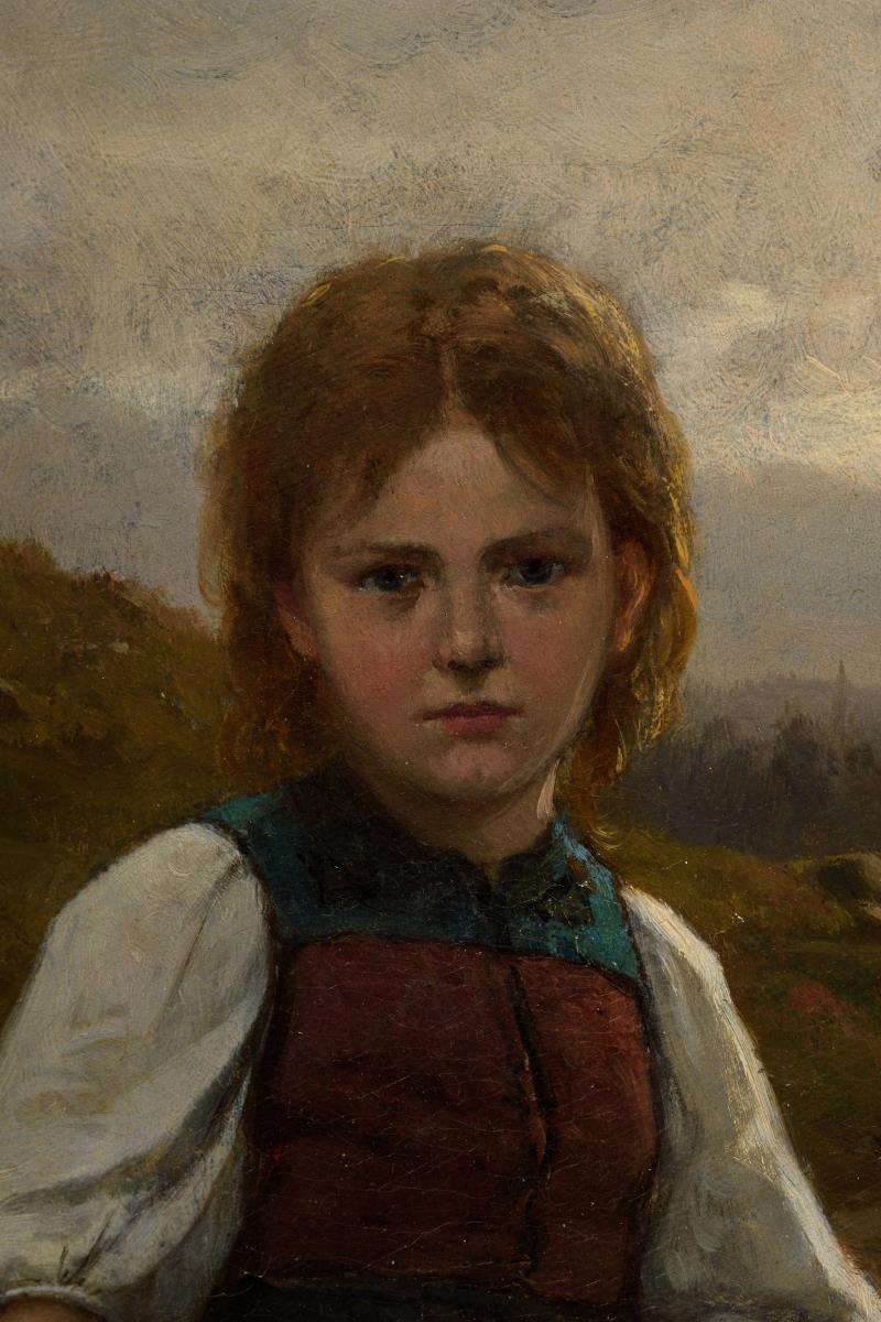 Bildnis eines kleinen Mädchens in ländlicher Kleidung auf einem Wiesenhang unter wolkigem Himmel.
