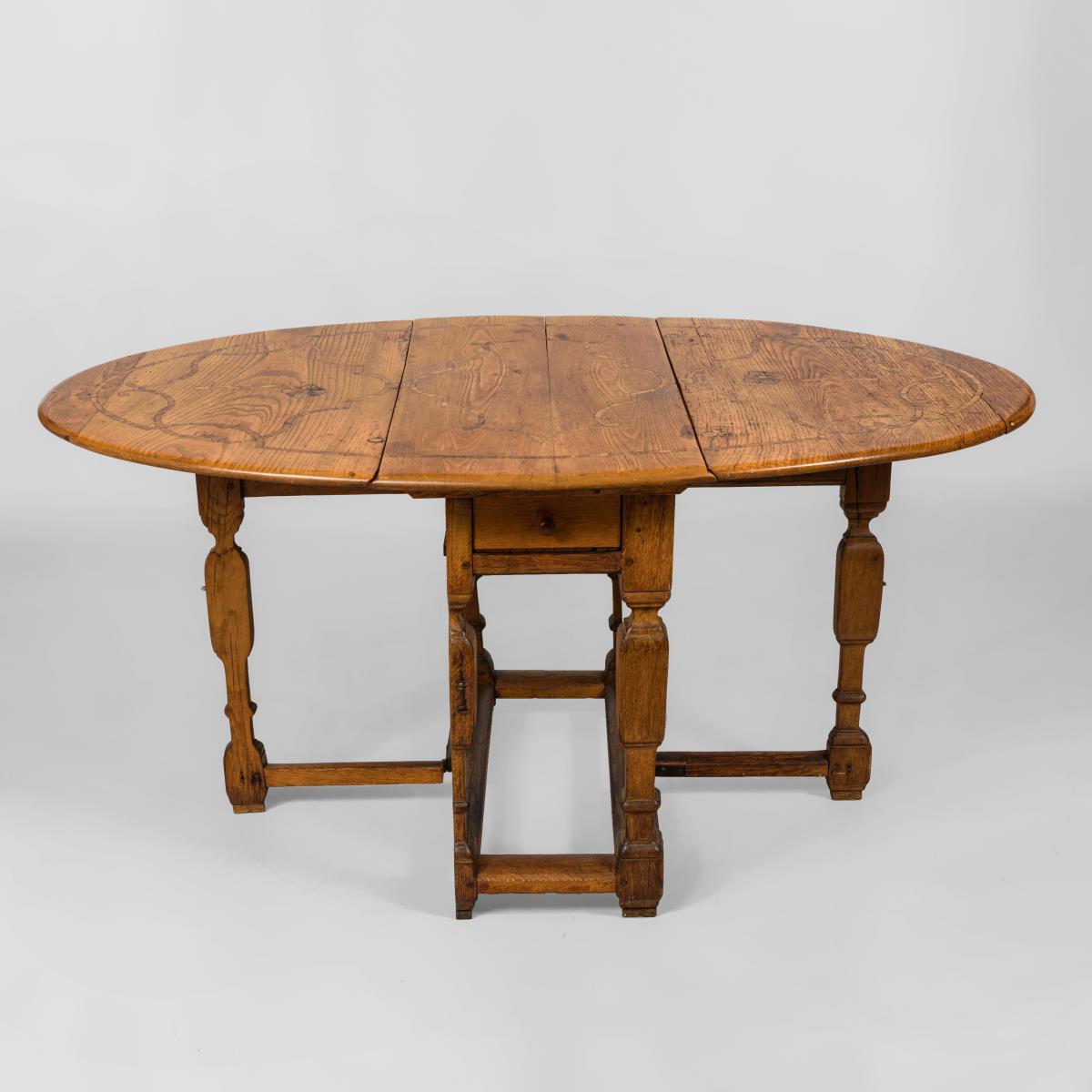Ovaler Gate-Leg-Tisch mit 2 herunterklappbaren Tischplatten und stützenden balusterartigen Torbeinen. Dekoriert mit Band- und Blumenintarsien. Trockenrisse, inaktiver Anobienbefall, kleine Ausbrüche im Scharnierbereich, restauriert.