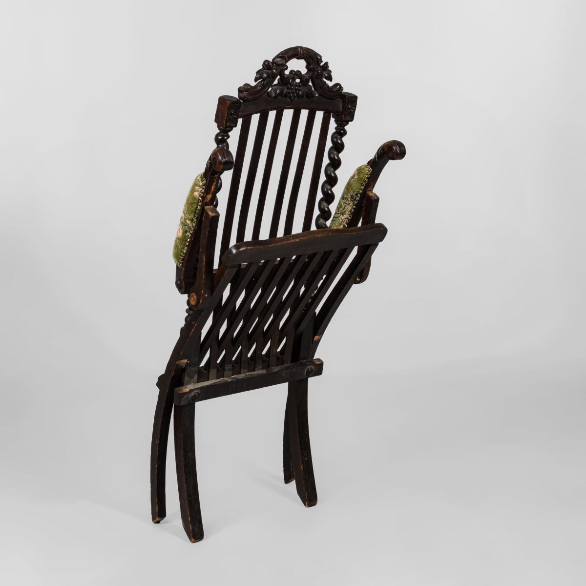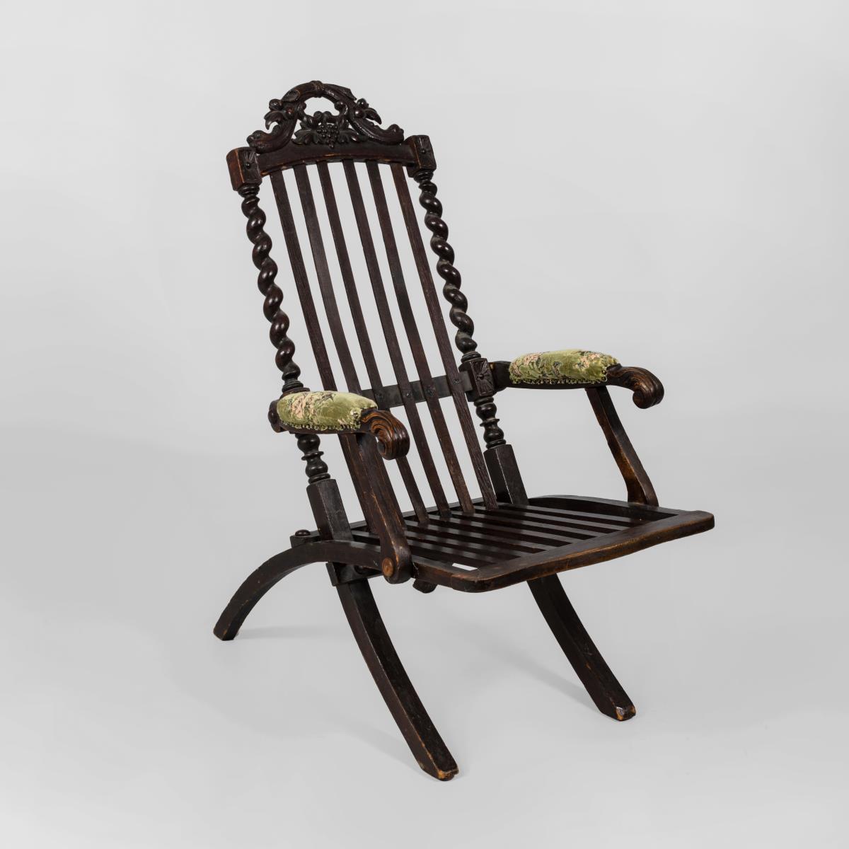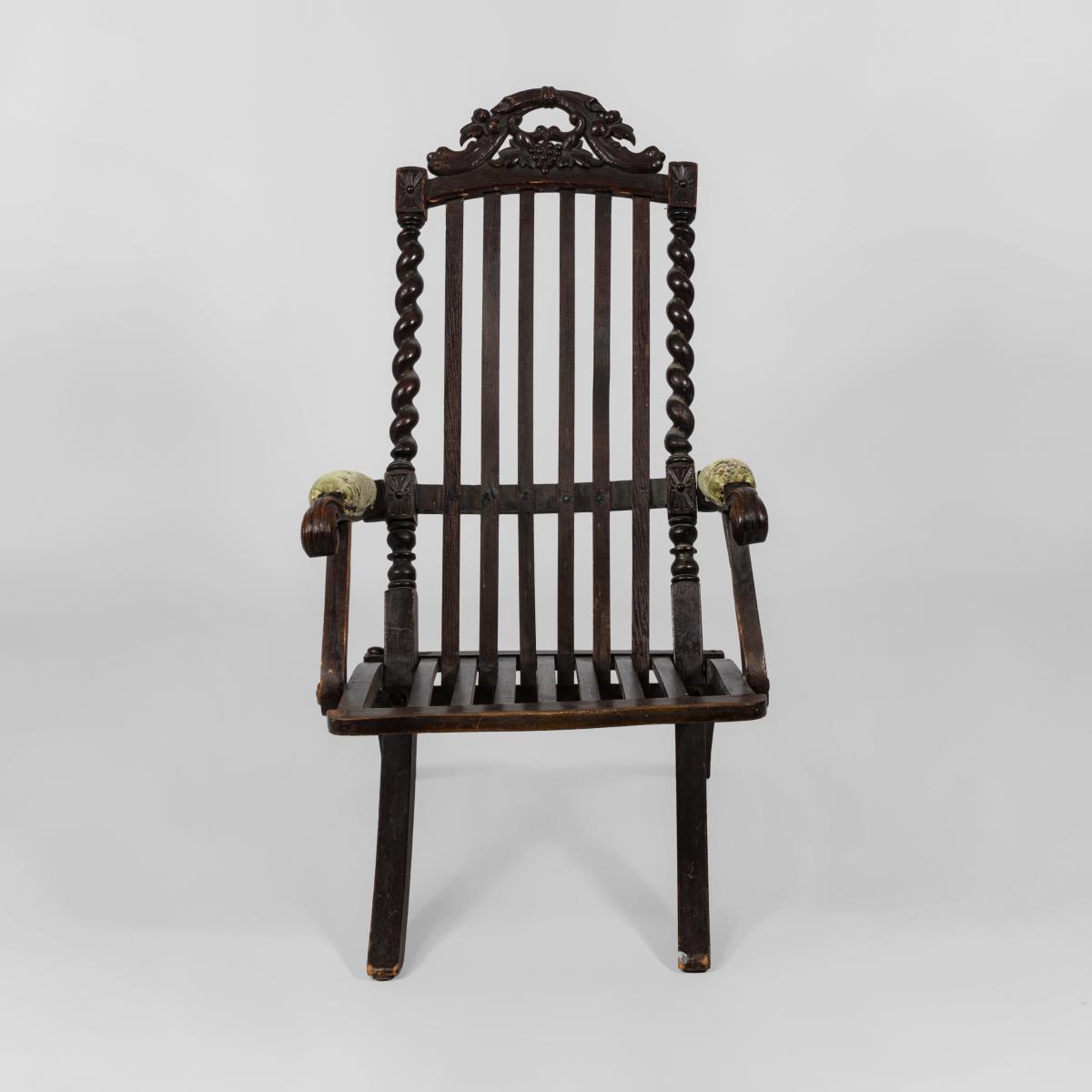 Sogenannter "Faulenzer" mit gepolsterten Armlehnen, hoher Lehne mit seitlichen Drechselstäben und floral beschnitztem Kopfbrett, versprosster Sitzfläche und gebogten Beinen. Alters-/Gebrauchsspuren.