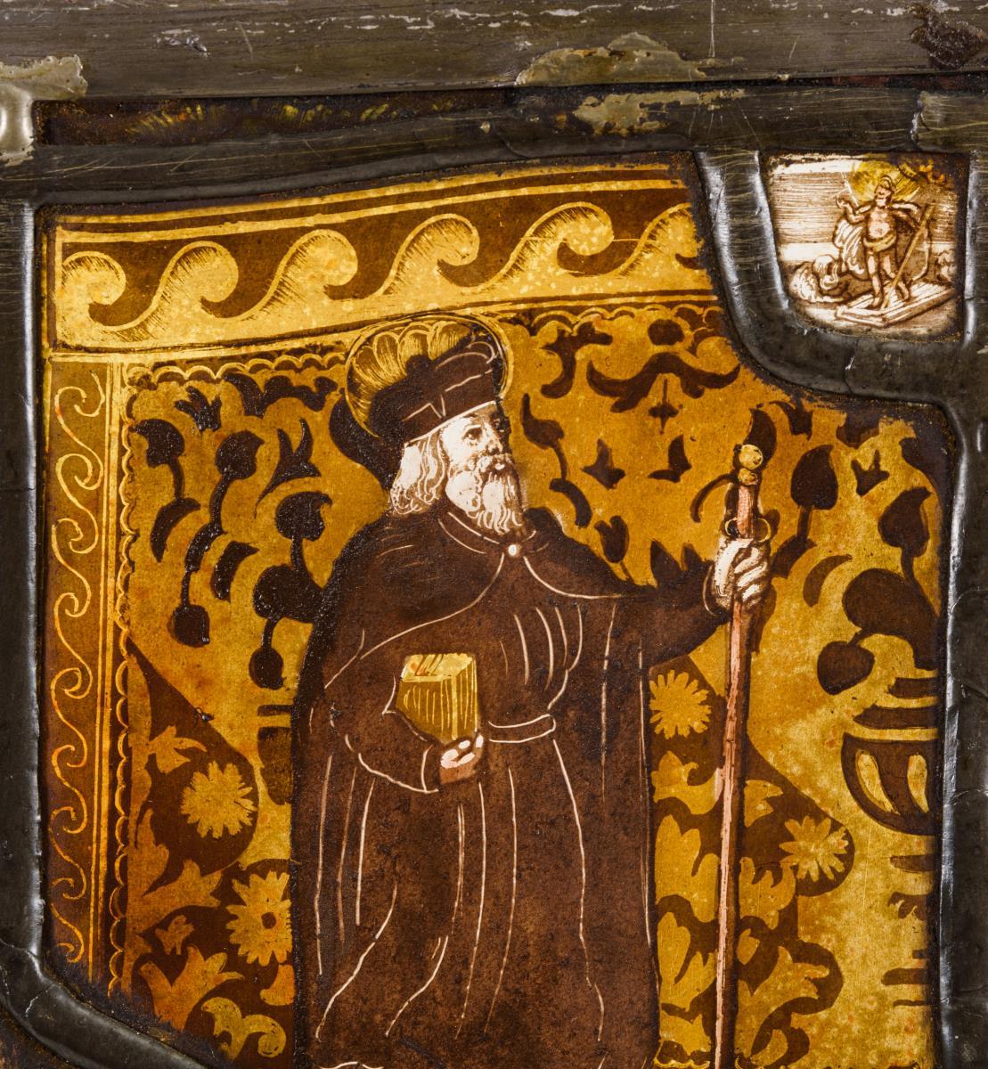 Farbloses und farbiges Glas, polychrom und mit Schwarzlot bemalt, Bleiruten. 44 x 32 cm.