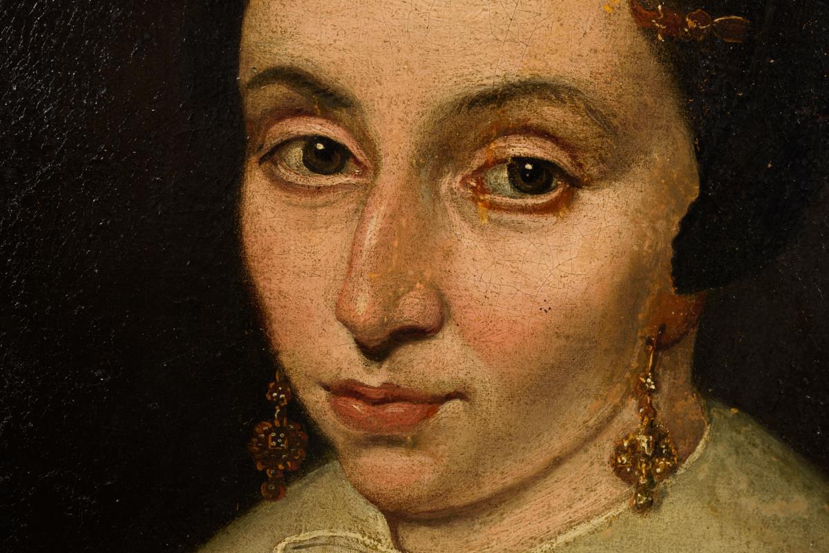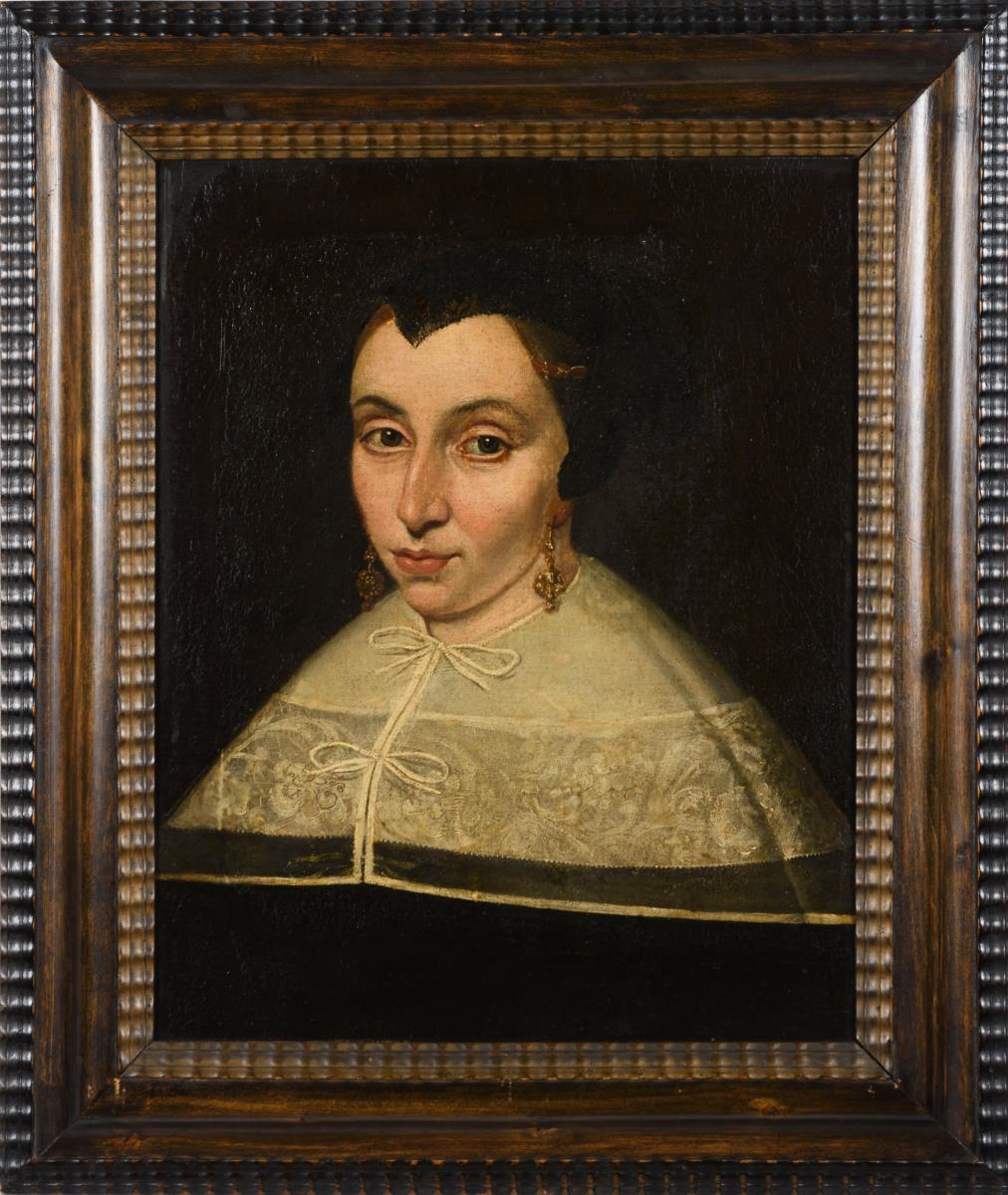 Bildnis einer Frau mit goldenem Ohrschmuck, weißem Kragen über dem schwarzen Kleid und schwarzer Haube. Altersspuren.