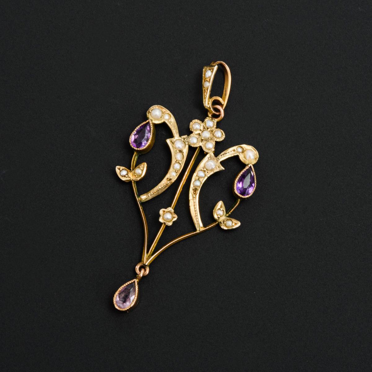 Englischer Jugendstil-Anhänger mit Amethysten und Perlchen.