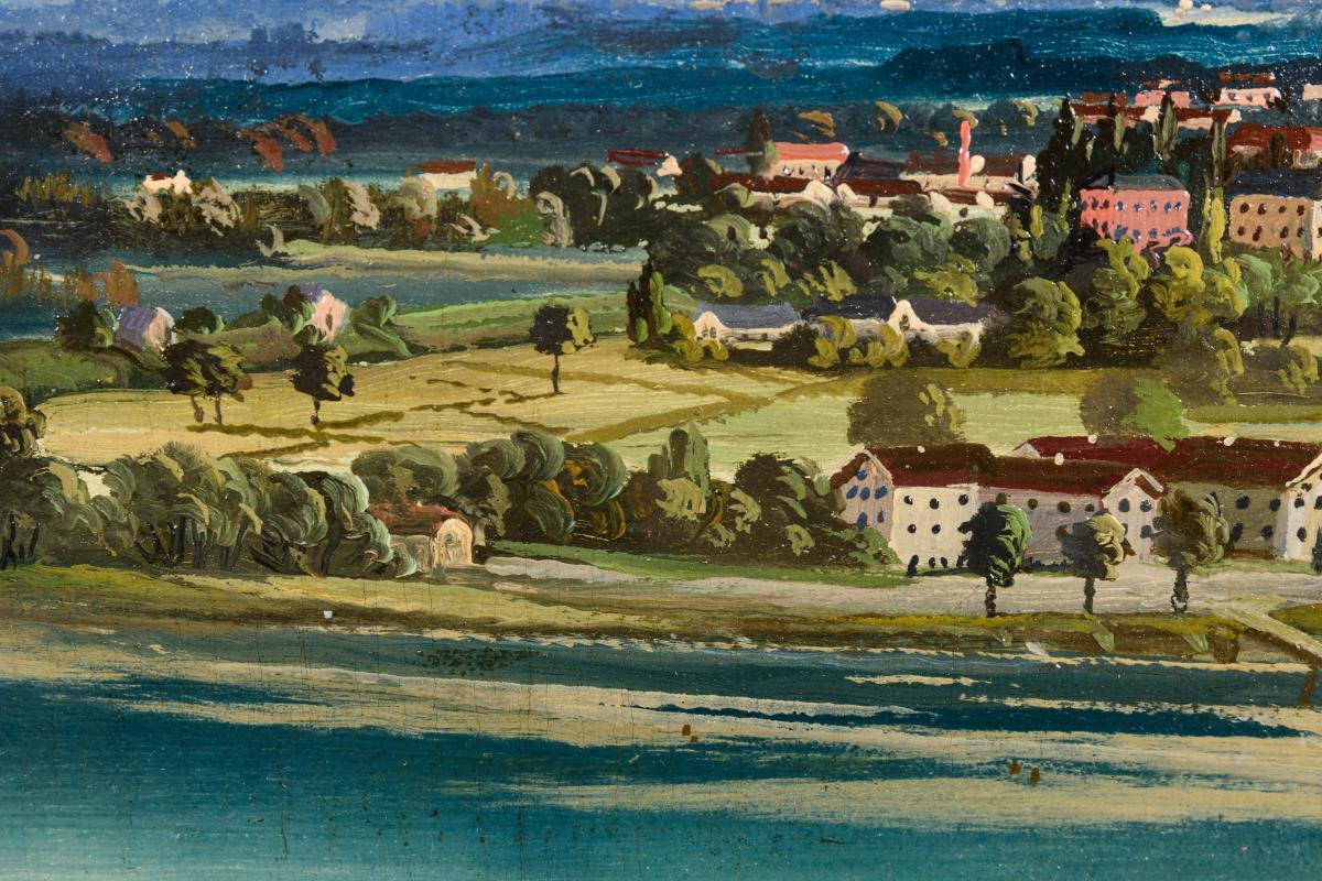 Flussbiegung mit Brücke nahe einer Stadt vor der weiten Bergkette im Sonnenschein. Minimale Altersspuren.