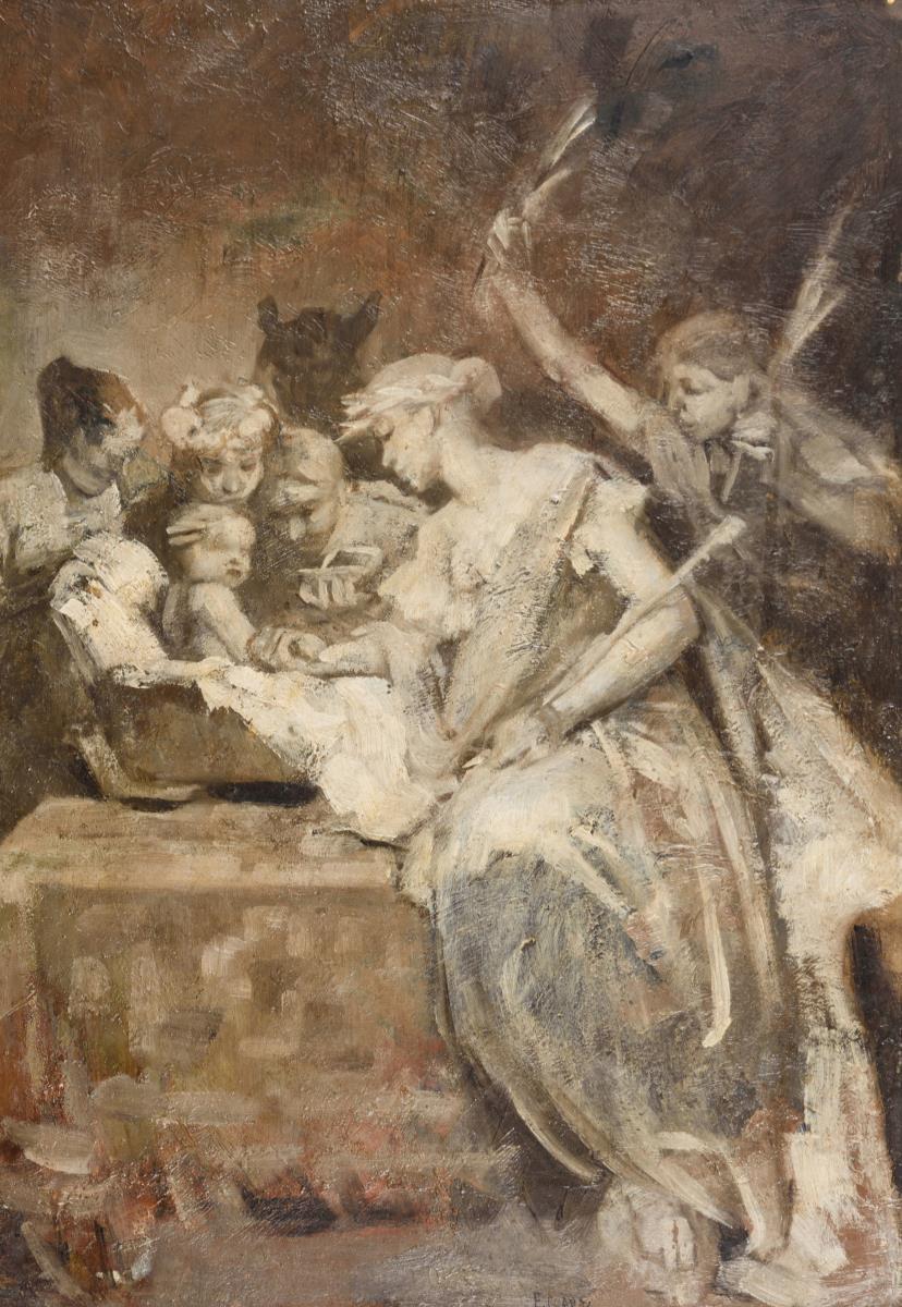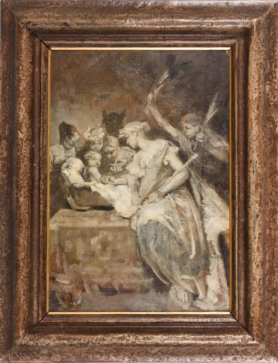 Studie in Grisaille mit mehreren wohl die Tugenden oder Musen darstellenden Frauenfiguren an der Wiege eines Babys.